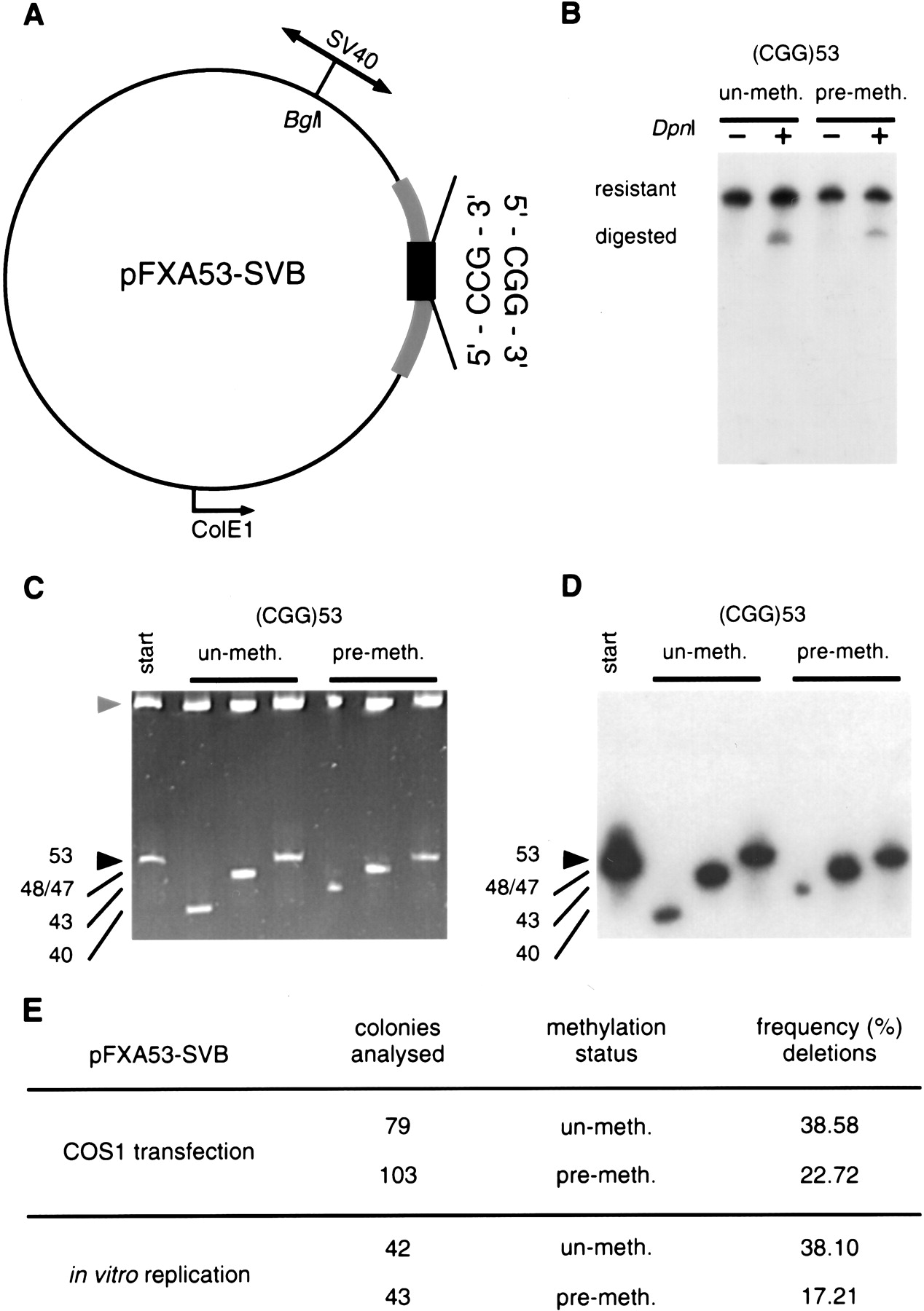 Effect of methylation on the genetic stability of (CGG)n repeats in a primate system. (A) The replication origin-containingSphI-HindIII fragment of the SV40 virus was cloned into the BglI site of pFXA53 (Table 1). The circular plasmid is drawn to scale. The location of the SV40-ori relative to the CGG tract defined the direction of mammalian replication. (B) The similar efficiency of replication of premethylated (SssI) and unmethylated templates in transfected COS1 cells (48 hr) or in vitro was confirmed by DpnI-resistance. Shown is a Southern blot of post-transfection KpnI/SacI digested DNAs hybridized with a 32P-labeled (CGG)10 oligonucleotide. (C) Replication products were analyzed for their repeat length alterations. Transfected or in vitro replication products were digested with DpnI (only DNAs that are products of mammalian replication are resistant to DpnI).DpnI-resistant replication products were transformed intoE. coli and DNAs were prepared from individual bacterial colonies, each derived from an individual product of mammalian replication. DNAs were analyzed for repeat changes by acrylamide gel electrophoresis. (D) Changes were confirmed to be the result of alterations in repeat numbers by electrotransfer and hybridization with a 32P-labeled (CGG)10 oligonucleotide. Shown is a representative gel with three single-colony/individual replication products of methylated (+) and unmethylated (−) templates. Individual products were also analyzed by DNA sequencing. (E) Frequencies of deletion events were scored. Background was subtracted from the mammalian mutation frequencies essentially as described (Panigrahi et al. 2002) (see Methods for details). Statistical analysis revealed a significant difference between the stability of methylated and unmethylated templates either in living cells (P = .014, χ2) or in vitro (P = .00088, χ2). These results are representative of at least two independent experiments.