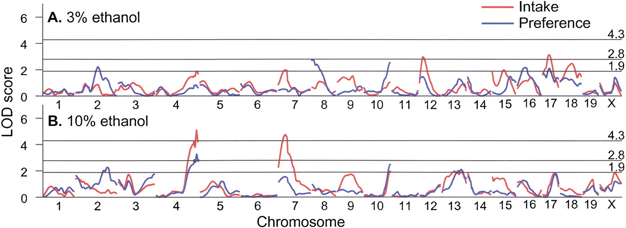 Genome-wide scan for linkages with indexes of 3% (A) and 10% (B) ethanol consumption. Distances between markers were estimated using MAPMAKER/EXP. Curves trace the logarithm of the odds ratio (LOD) scores calculated under an unconstrained (free) model using MAPMAKER/QTL. Horizontal lines show thresholds for significant (LOD 4.3) and suggestive (LOD 2.8) linkages under the unconstrained model (Lander and Kruglyak 1995), and a more relaxed threshold (LOD 1.9) used to identify regions of potential linkages for additional genotyping.