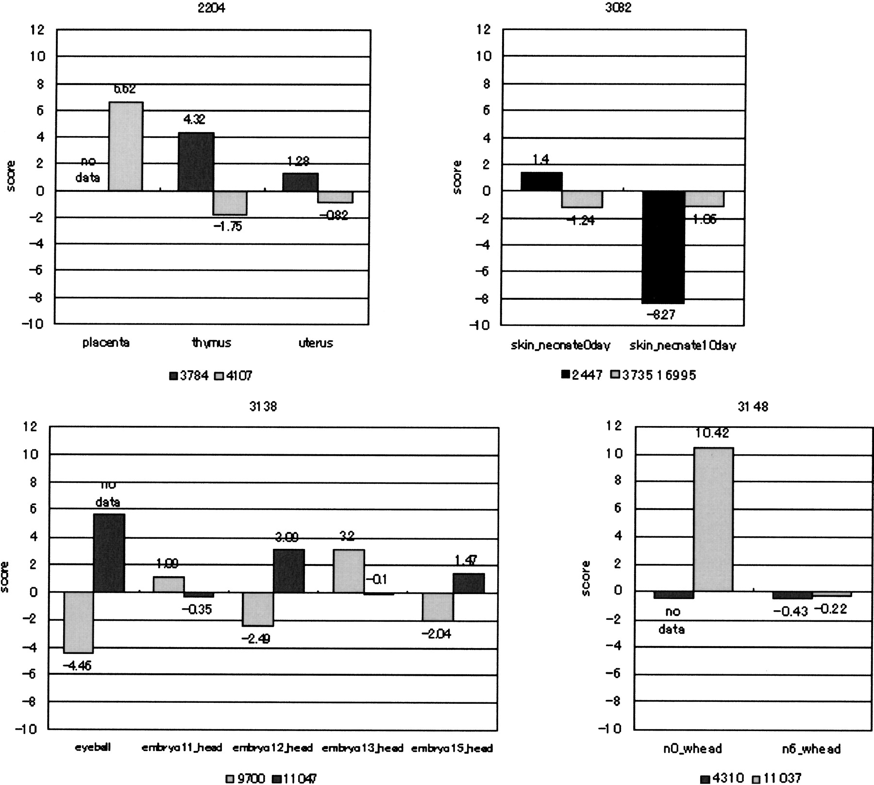 The horizontal axis is the tissue in which the gene expression was observed. The vertical axis is the level of gene expression as a score of signal intensity between cDNAs (log).