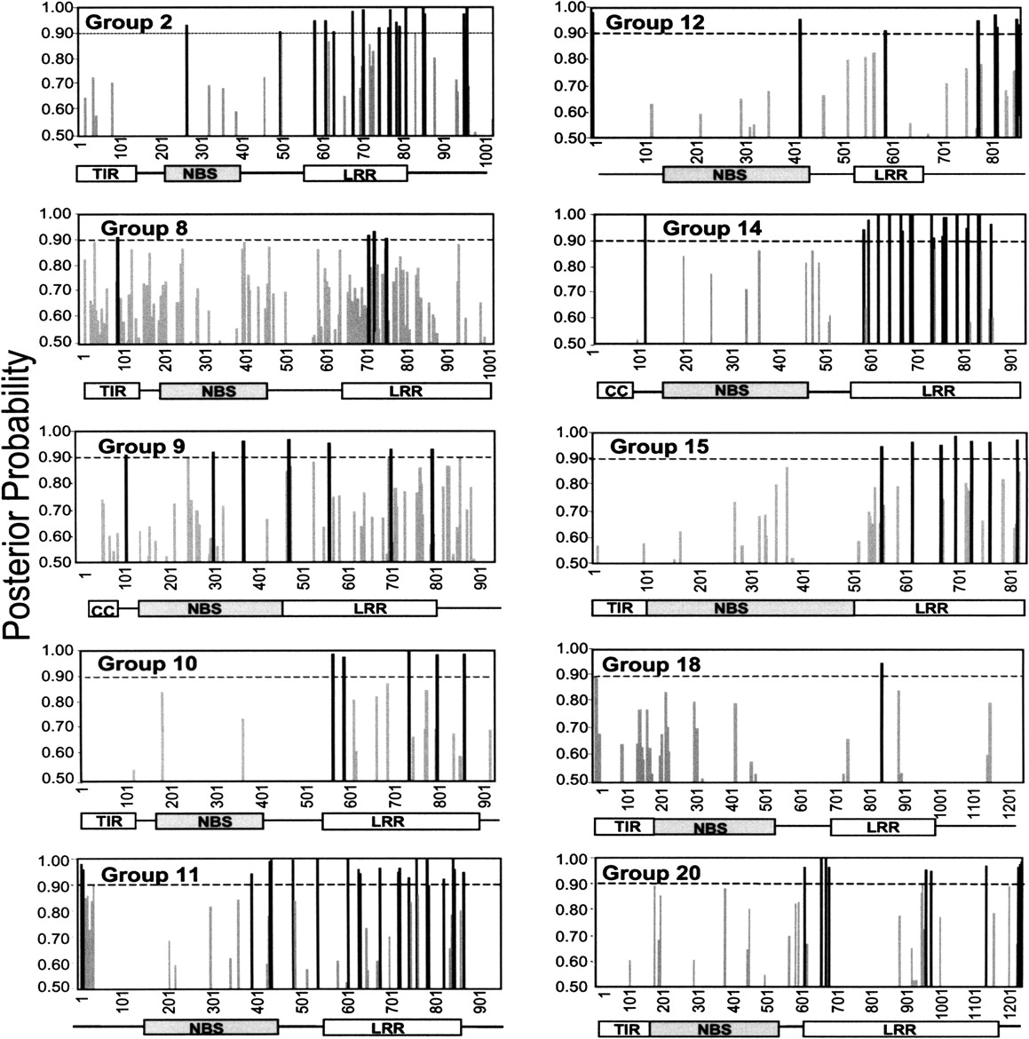 The posterior probability for sites in the positively selected class (ω > 1). Each graph represents 1 of the 10 sequence groups for which positive selection was detected by comparison of M7 and M8. TheX-axis denotes position in the amino acid alignment. Sites with black bars had a posterior probability >0.9 under M8; sites with gray bars did not have posterior probabilities >0.9. Boxes under each graph denote domain structures of nucleotide sequences in the group, as identified either by Pfam (groups 2, 8, 9, 11, and 12) or by comparison to groups containing previously described R genes (groups 10, 14, 15, 18, and 20).
