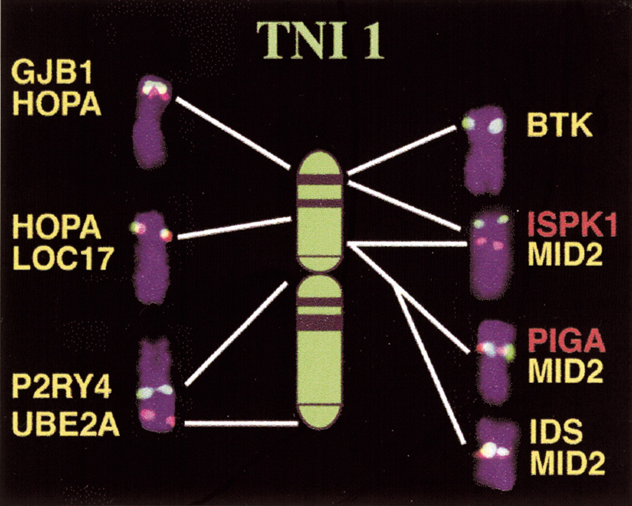 Localization of human Xp (indicated by red gene symbols) and Xq (green) orthologous genes on a TNI 1 ideogram. TNI 1 chromosomes with representative FISH signals of 10 genes were cut out from different metaphases.