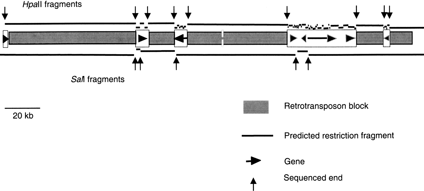 Structure of the maize adh1-F region, an example of a genic segment of the maize genome. Narrow shaded boxes indicate blocks of methylated DNA consisting of nested retrotransposons (SanMiguel et al. 1996). The open boxes indicate gene islands, with genes depicted as arrows or arrowheads oriented in the predicted direction of their transcription and with a length indicative of their predicted initial transcript size. The lines indicate the predicted HpaII (top) or SalI (bottom) fragments that would be generated from digestion of maize genomic DNA if all of theHpaII and SalI sites in the retrotransposon blocks are 100% methylated at all 5′-CG-3′ and 5′-CNG-3′ sites, while these sites are 100% unmethylated in the gene islands. Vertical arrows indicate MSLL ends that would be sequenced. Data taken from Tikhonov (Tikhonov et al. 1999).