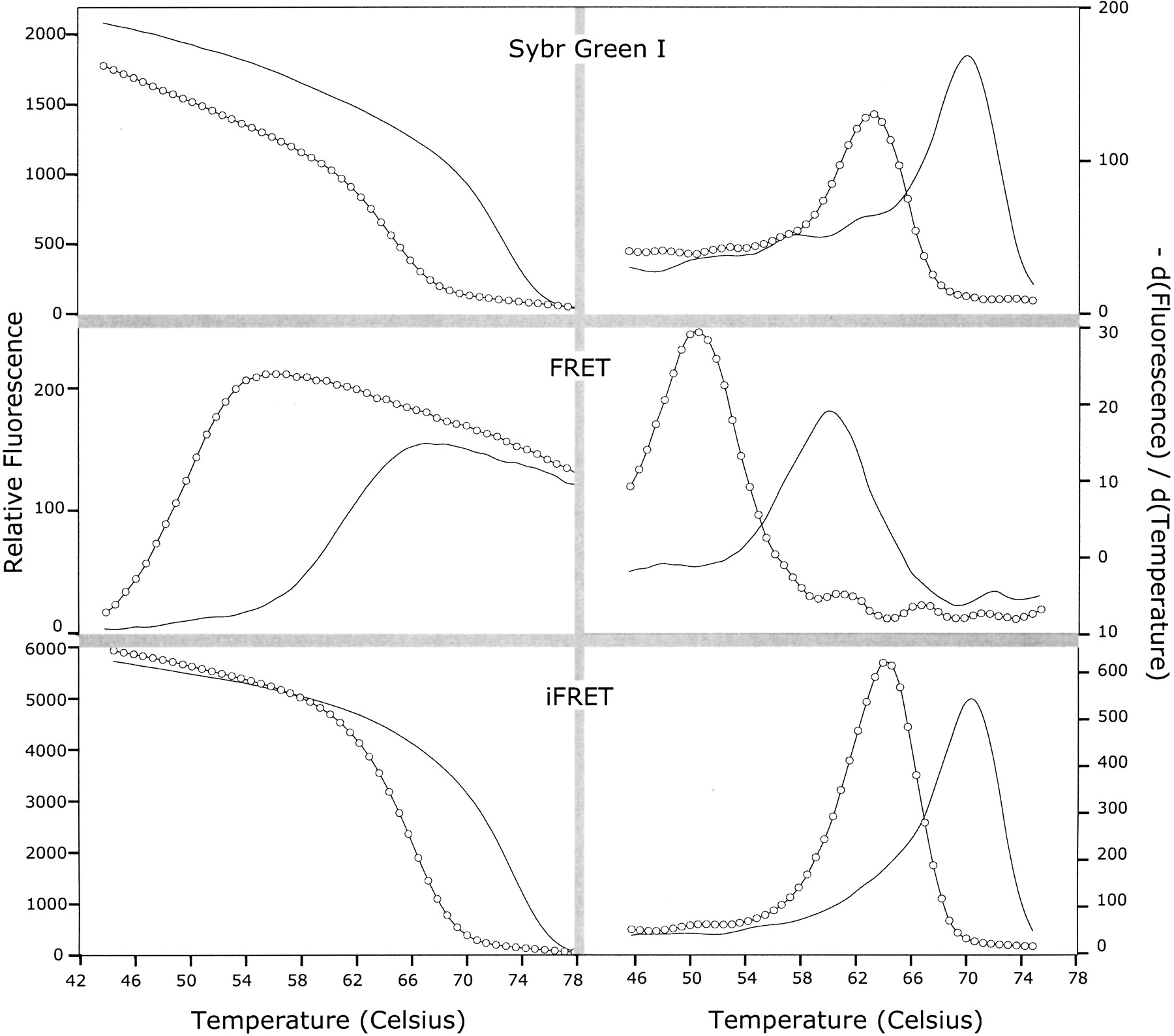 Melting curves for matched duplexes (solid lines) and single-base mismatch duplexes (hollow circles) are presented. For each indicated detection system, the graph to the left depicts fluorescence versus temperature, and the graph to the right is the derivative versus temperature.