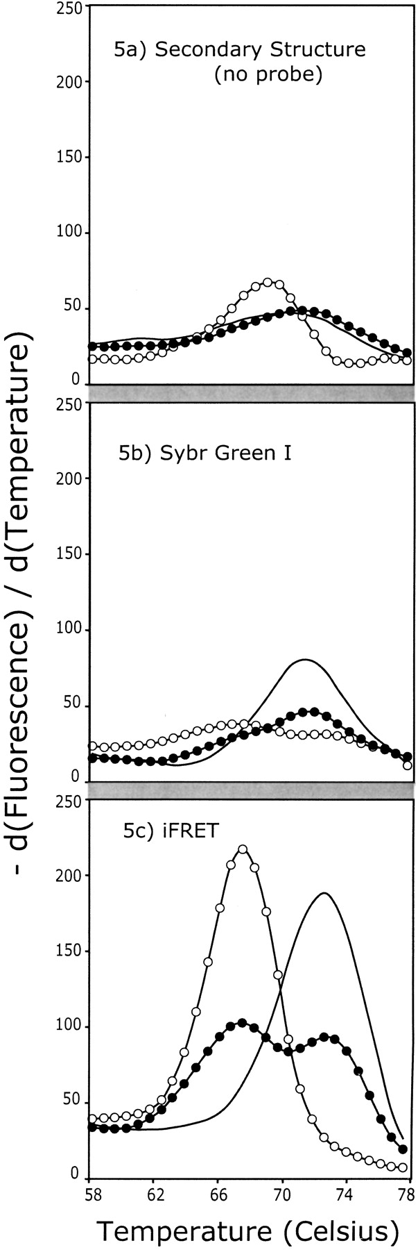 Melting curves of three DNA samples. Negative derivatives of DASH melting curves for PCR products for homozygous match (solid line), heterozygous (filled circles), and homozygous mismatched (hollow circles). (A) Secondary structure (no probe) signals are compared with (B) probe/target duplex signals created by Sybr Green I and (C) iFRET detection schemes.