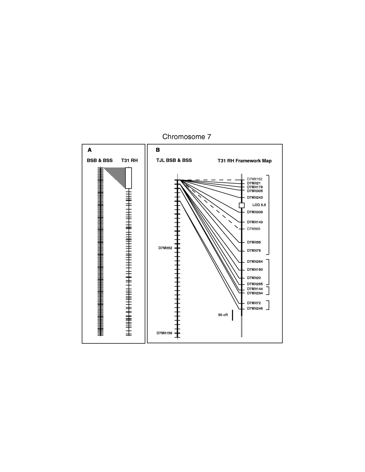 Chromosome 7 framework map showing suppression of recombination near the centromere. All maps are drawn with the centromere at thetop. (A) Shows on the left the entire Chr 7 recombination map from TJL BSB/BSS backcrosses with crosshatches for each crossover and heavy crosshatches every 10 crossovers. A gray triangle shows the proportion of the T31 RH framework map that is nonrecombinant at the proximal end of the backcross map. (B) Shows greater detail of this proximal region of the backcross and RH maps. Heavy crosshatches on TJL BSB/BSS chromosome figure indicate positions of framework markers. Brackets on the rightindicate the groups of markers on the RH map that fail to recombine in the backcross. Locus symbols in plain text indicate markers that are mapped only in the 94 animals of the BSS cross due to failure of theMus spretus allele to amplify in heterozygotes. An interval of LOD less than 6 is indicated with an open box over the RH chromosome line. Note that all locus symbols should be printed in italics, but are shown here in plain text for readability.