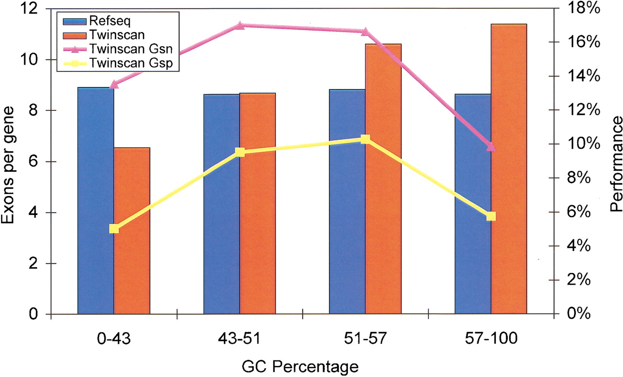 Effect of GC bin on exact gene prediction. Bars indicate the number of exons per gene in the TWINSCAN predictions and the RefSeq annotations in each GC bin. Points indicate TWINSCAN's sensitivity and specificity for exact gene prediction in each GC bin. Exact gene accuracy is higher when TWINSCAN's predictions have 9–10 exons per gene.
