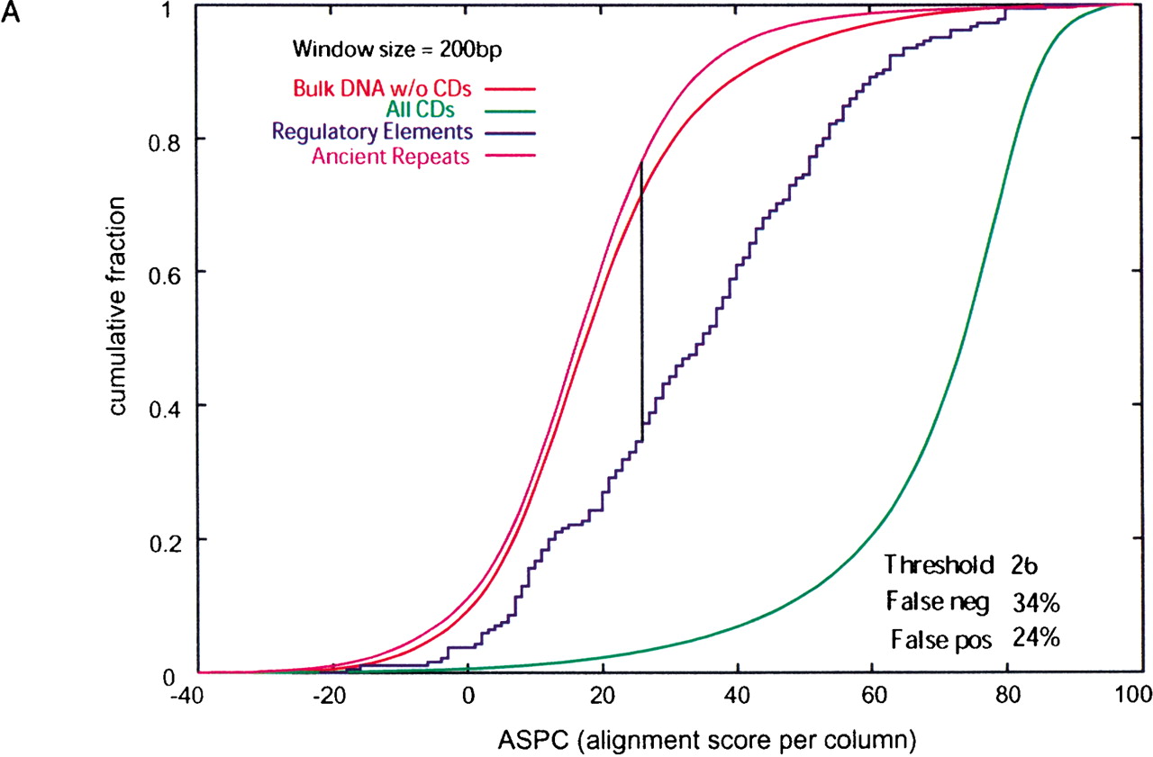 (A) Cumulative distributions of ASPC (alignment score per column) in 200-bp nonoverlapping windows from regulatory elements, ancient repeats, coding exons (cds), and bulk DNA alignments. The ASPC is calculated using the BLASTZ scoring scheme with a penalty for gaps. The vertical line represents the ASPC value at which regulatory element and ancient repeat distributions intersect (i.e., maximal distance between cumulative distributions). With this as a threshold, one obtains a certain percentage of false positives (ancient repeats above the threshold) and false negatives (regulatory elements above the threshold). (B) Cumulative distributions of gap density in 200-bp nonoverlapping windows from regulatory elements, ancient repeats, coding exons (cds), and bulk DNA alignments. The vertical line and percentages of false positives and false negatives are obtained as for ASPC in A, except that here false positives are ancient repeats below the threshold, and false negatives are regulatory elements above it.