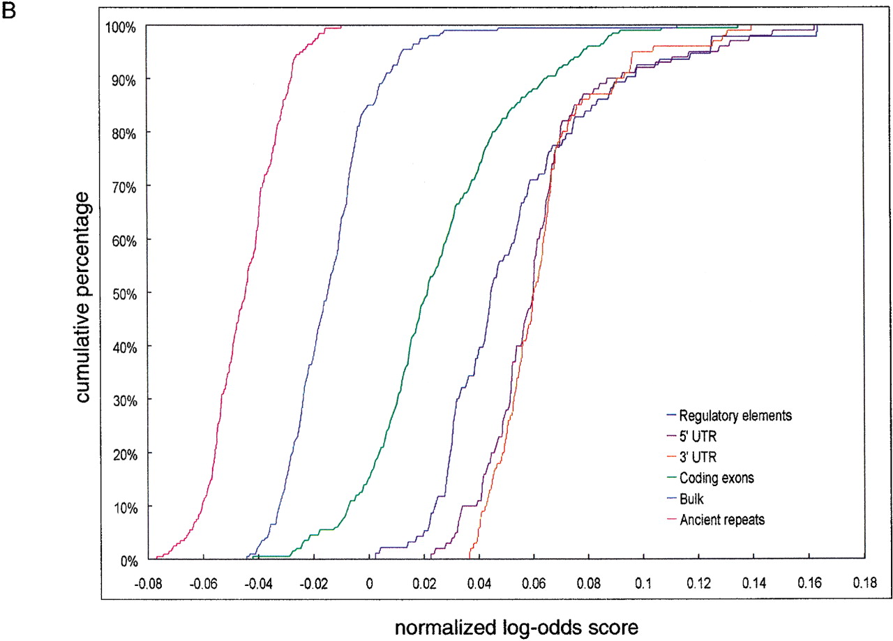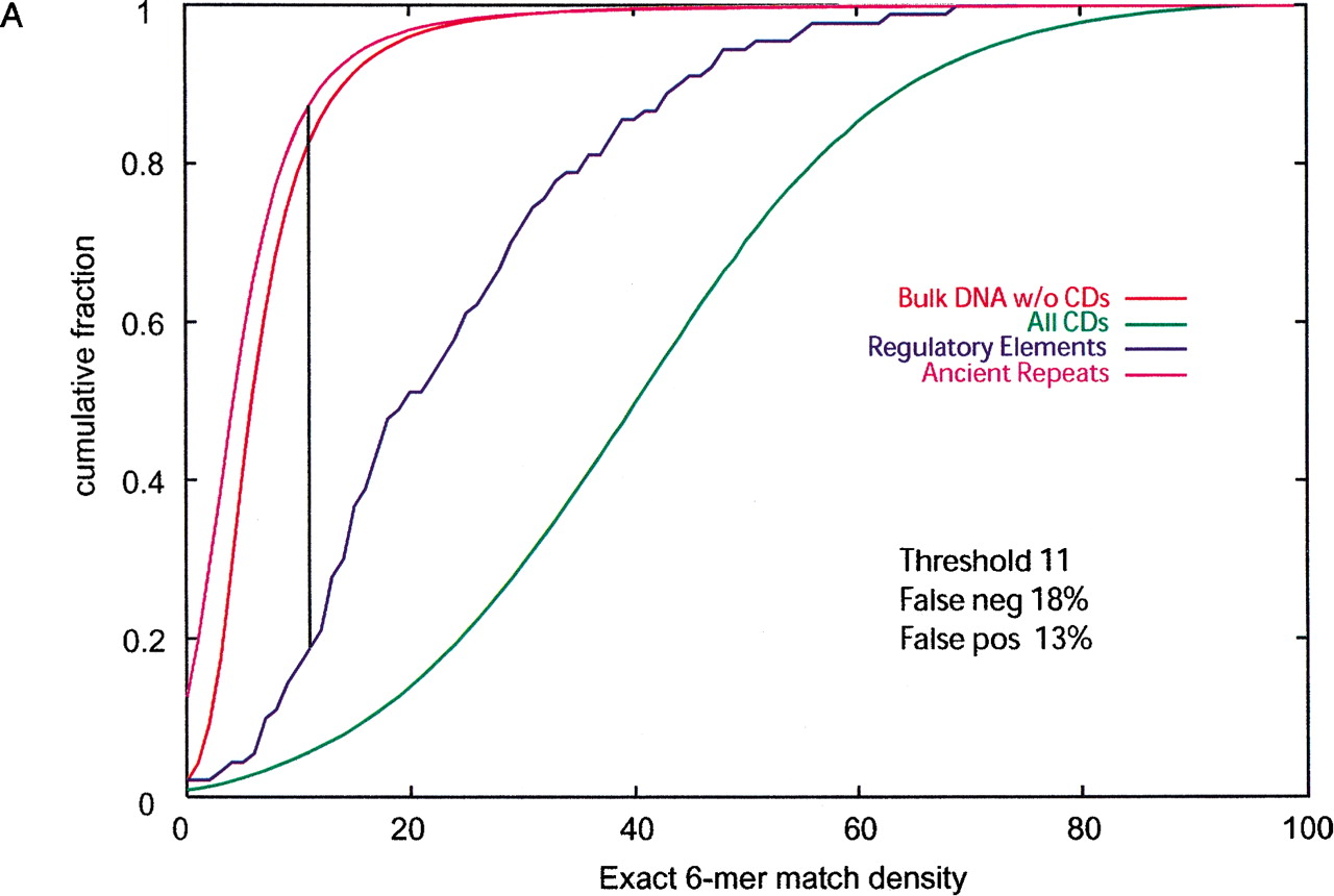 (A) Cumulative distributions of exact hexamer matches density in 200-bp nonoverlapping windows from regulatory elements, ancient repeats, exons, and bulk DNA alignments. The density is calculated by scrolling over 6-nt sequences with no gaps in each window. Vertical line and percentages of false positives (ancient repeats above the threshold) and false negatives (regulatory elements below the threshold) are obtained as for ASPC in Figure 1A. (B) Cumulative distributions of (normalized) log-odds score from fifth-order 5-symbol alphabet Markov Models. The score expression is derived based on 93 regulatory elements and 200 alignment segments of size 200 bp randomly selected from ancient repeats. The cumulative distributions for these are shown in dark blue and magenta, respectively. Because the distributions do not intersect, any threshold between the maximum score value for ancient repeats and the minimum score value for regulatory elements guarantees 0% false positives and 0% false negatives. The green, orange, purple, and bright blue cumulative distributions are obtained applying the score expression to segments from coding regions, UTRs, and bulk DNA.