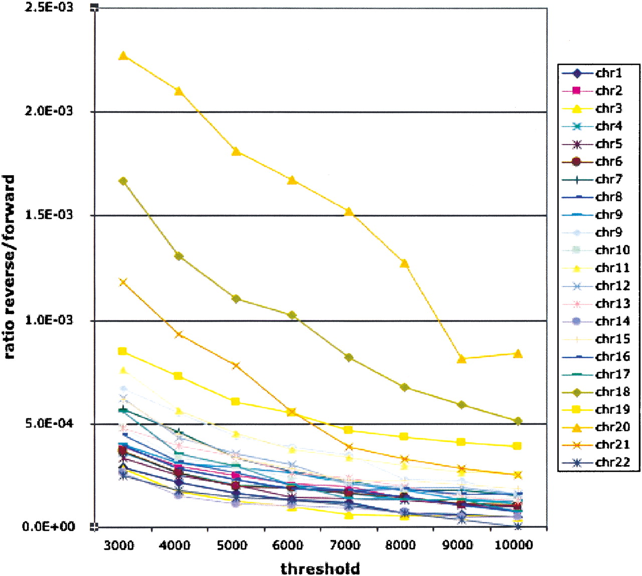 The ratio of the number of nucleotides on each human chromosome covered by alignments of the random mouse sequence and the number of nucleotides covered by the real mouse sequence for each chromosome. Threshold definition is described in the alignment section of Waterston et al. (2002).