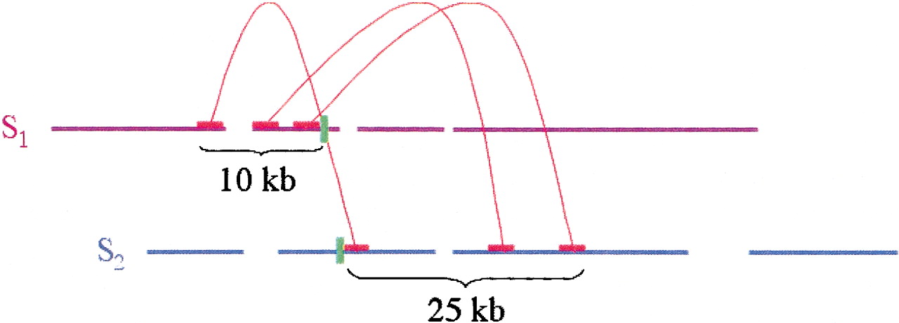 Positive breaking of supercontigs. Three correlated links are seen between supercontigs S1 and S2. The spread of the connection between S1 and S2 is, in this case, the lesser of 10 kb and 25 kb, which is 10 kb. Because the positive breaking algorithm as applied to mouse required five links with spread at least 50 kb, this connection would not have been sufficient to break the supercontigs. If it were, the respective supercontigs would have been broken at the exact ends of reads (green bars).