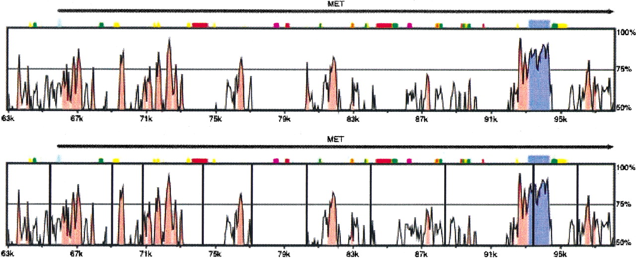 Cat versus mouse: A VISTA picture showing an AVID alignment of the 5′ region of the MET gene in cat and mouse. The top panel shows the alignment of the two finished sequences with the X-axis showing coordinates in the mouse, and the Y-axis showing the %identity in a 100-bp window. The bottom panel shows the results of a draft placement simulation: the cat sequence has been sliced at locations corresponding to the vertical black lines. The resulting contigs were permuted (order and orientation changed randomly) and realigned to the mouse.