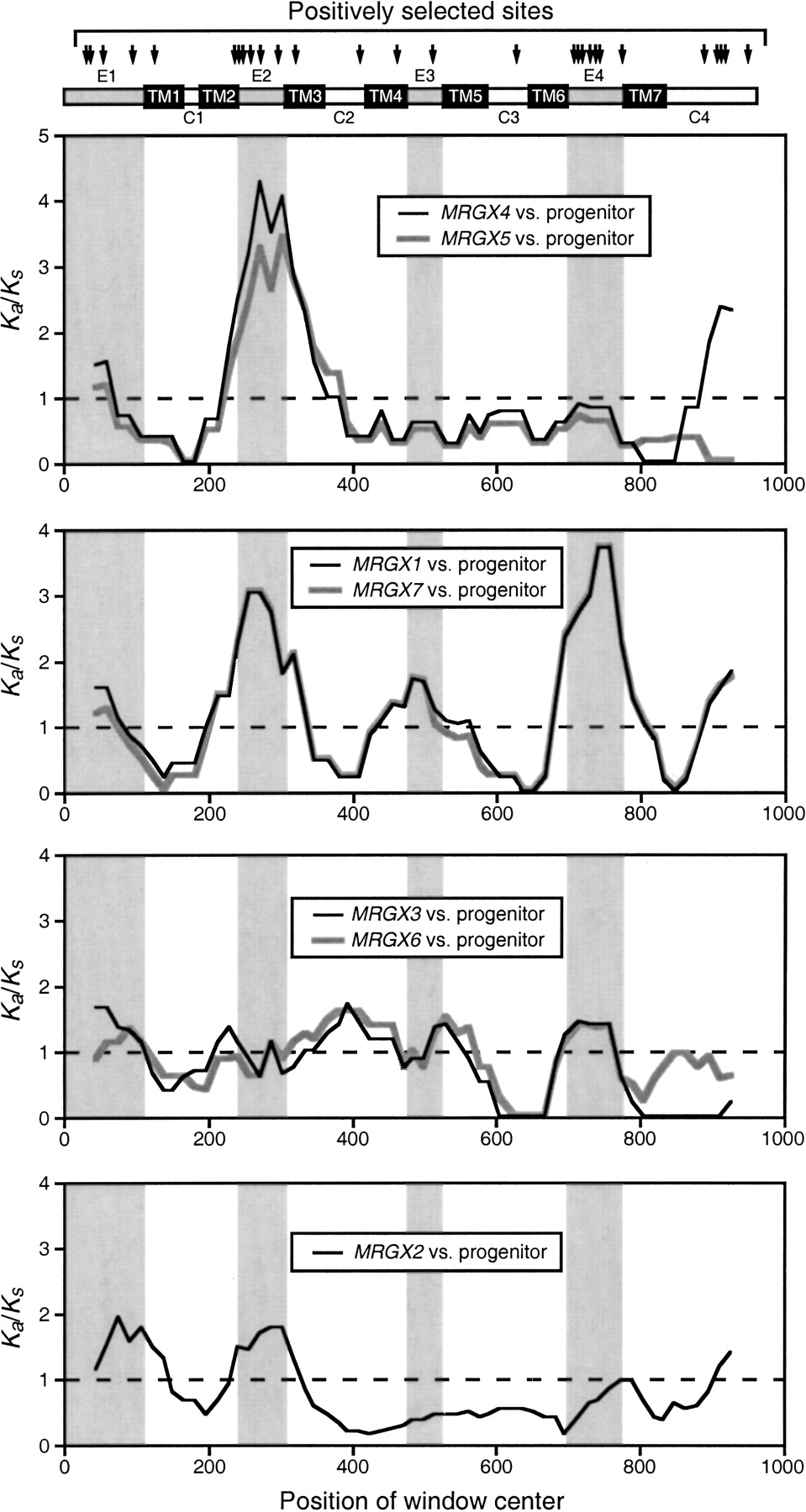 Sliding-window analysis of Ka/Ks performed between each human MRGX gene and the deduced sequence of the progenitor node (indicated in Fig. 1A). The four panels represent four distinct profiles in the seven comparisons. Vertical arrows at the top indicate positions of codons under positive selection as revealed by the Maximum Likelihood analysis (Yang 1998; these positions with respect to MRGX1 are 11, 12, 18, 32, 43, 78, 79, 82, 86, 91, 99, 108, 136, 153, 171, 208, 236, 239, 240, 244, 246, 247, 262, 298, 303, 305, 307, and 319).