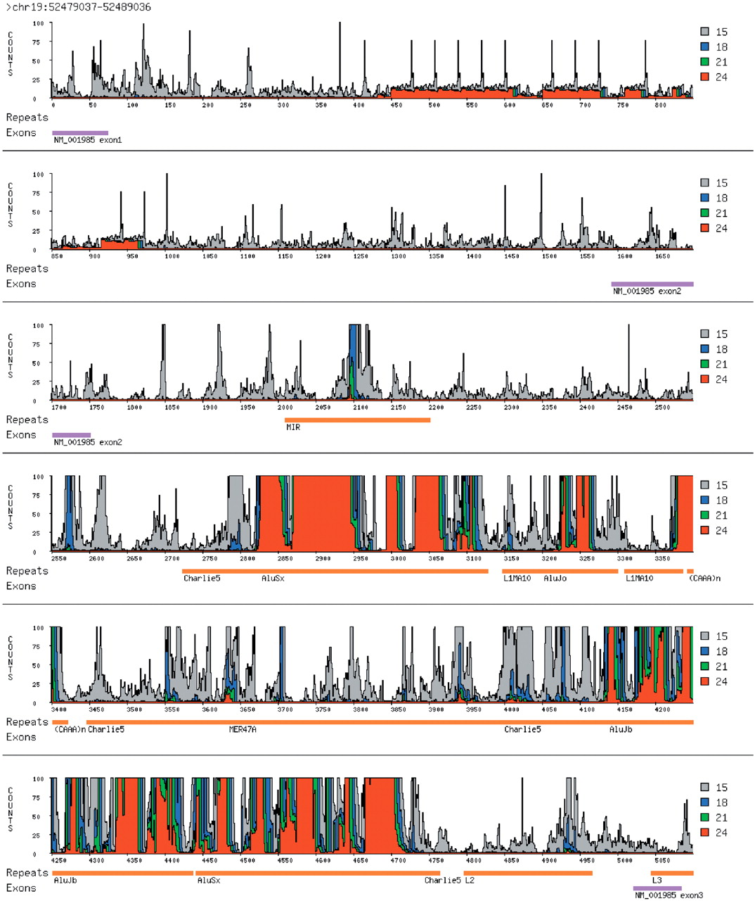 Word count terrain from a 5-kb region on chromosome 19. The coordinates of this region in the June 2002 assembly of the human genome are at the top. Along the x-axis is the relative position of a given word within the region; along the y-axis is the absolute word count, with counts for different lengths drawn in different colors, according to the legend. Word counts are capped at 100. Underneath the terrain, repeats detected by RepeatMasker are annotated in orange. Exons from the RefSeq data set are indicated in purple. In this case, the word counts are derived from the June 2002 assembly of the entire human genome.