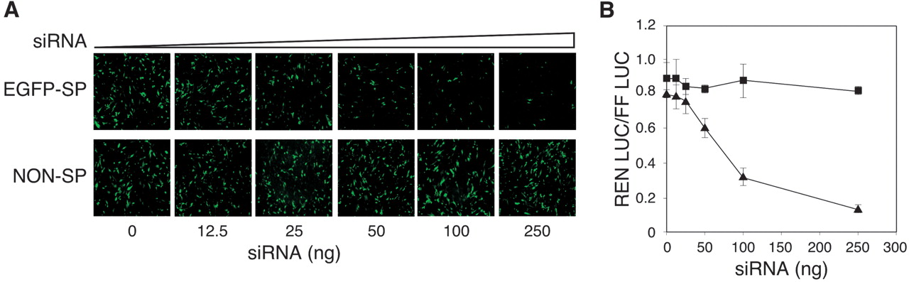 Quantitation of siRNA-mediated target gene silencing. (A) C2C12 cells were transfected with a constant amount of EGFP-Rluc (expressing EGFP-Renilla luciferase fusion protein), pGL3-Control (expressing firefly luciferase as internal control), and increasing concentrations of EGFP-specific siRNA (upper panel) and nonspecific siRNA (lower panel). At 24 h posttransfection cells, were imaged for EGFP expression. (B) Normalized relative amount of Renilla and firefly luciferase (n=3) as a function of treatment with nonspecific siRNA (▪) or EGFP-specific siRNA (▴) were plotted. Cotransfection without siRNA served as a control. A scrambled siRNA served as a nonspecific control.
