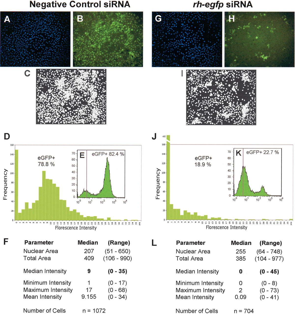 Single-cell level quantification of RNAi on a microarray platform. The imaging and quantification of fluorescence in HeLa/d2eGFP cells plated on two representative siRNA spots (a negative control cat siRNA spot [A-F] and an experimental rh-egfp siRNA spot [G-L], 2.5 ng of siRNA per spot) on a microarray slide. To quantify the effect of the siRNAs on GFP silencing, green fluorescence DAPI-stained nuclei (A,G) and “watershed” boundaries (defined using the green fluorescence images, B and H) were used to locate and define the area for the cells (white) in each of the two images (C and I; see Supplemental Fig. A). These segmented images were used to measure single-cell parameters used in subsequent data analysis (Supplemental Material, data sets 1 and 2). (D,J) For each spot, the distribution of the median green fluorescence (after local background fluorescence subtraction) in every segmented cell was plotted. A cell was considered to be positive for eGFP green fluorescence when its median fluorescence intensity was >4 units in the green channel. The distributions of the median green fluorescence intensities obtained by microarray analysis (D,J) were compared with traditional flow cytometric measurements of Hela/d2eGFP cells (10,000 events) transfected with the same siRNAs (E,K). The vertical line indicates the estimated level of background fluorescence. The degree of gene silencing detected by flow cytometry was consistent with that detected by the RNAi microarray imaging system. Statistical analysis (F,L) indicated a decrease in the green fluorescence intensities when the data fromthe cat siRNA and an rh-egfp siRNA spot were compared, whereas other parameters, such as the total cell area and nuclear area were similar in the two spots.