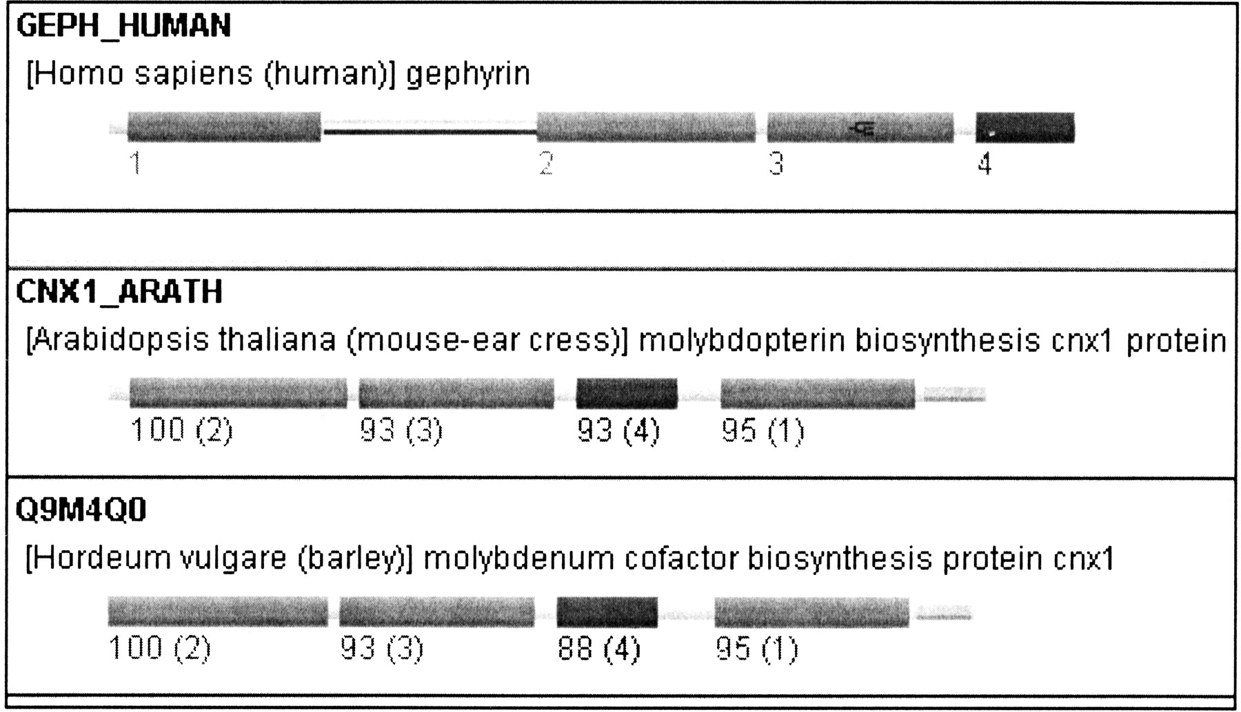 Analyzing orthology for multidomain proteins. Displayed are the two highest scoring orthologs for GEPH_HUMAN: CNX1_ARATH and Q9M4Q0. The numbers below the domains are the ortholog bootstrap values (%). The number in brackets after the score indicates the corresponding orthologous domain in GEPH_HUMAN. Although the order of the domains is different, all domains show a high orthology score to the corresponding domain in GEPH_HUMAN.