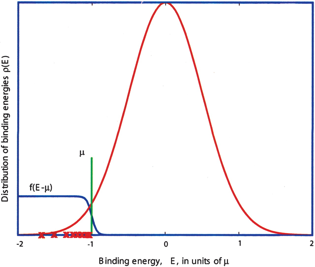 Distribution of binding energies (red curve) in the ensemble of random sequences is approximately Gaussian (although limited to the Emin, Emax interval set by the best and the worst binding sequences, respectively). The blue line represents the binding probability of TF present at a concentration corresponding to the chemical potential µ. The red crosses illustrate possible binding energies of example sequences.
