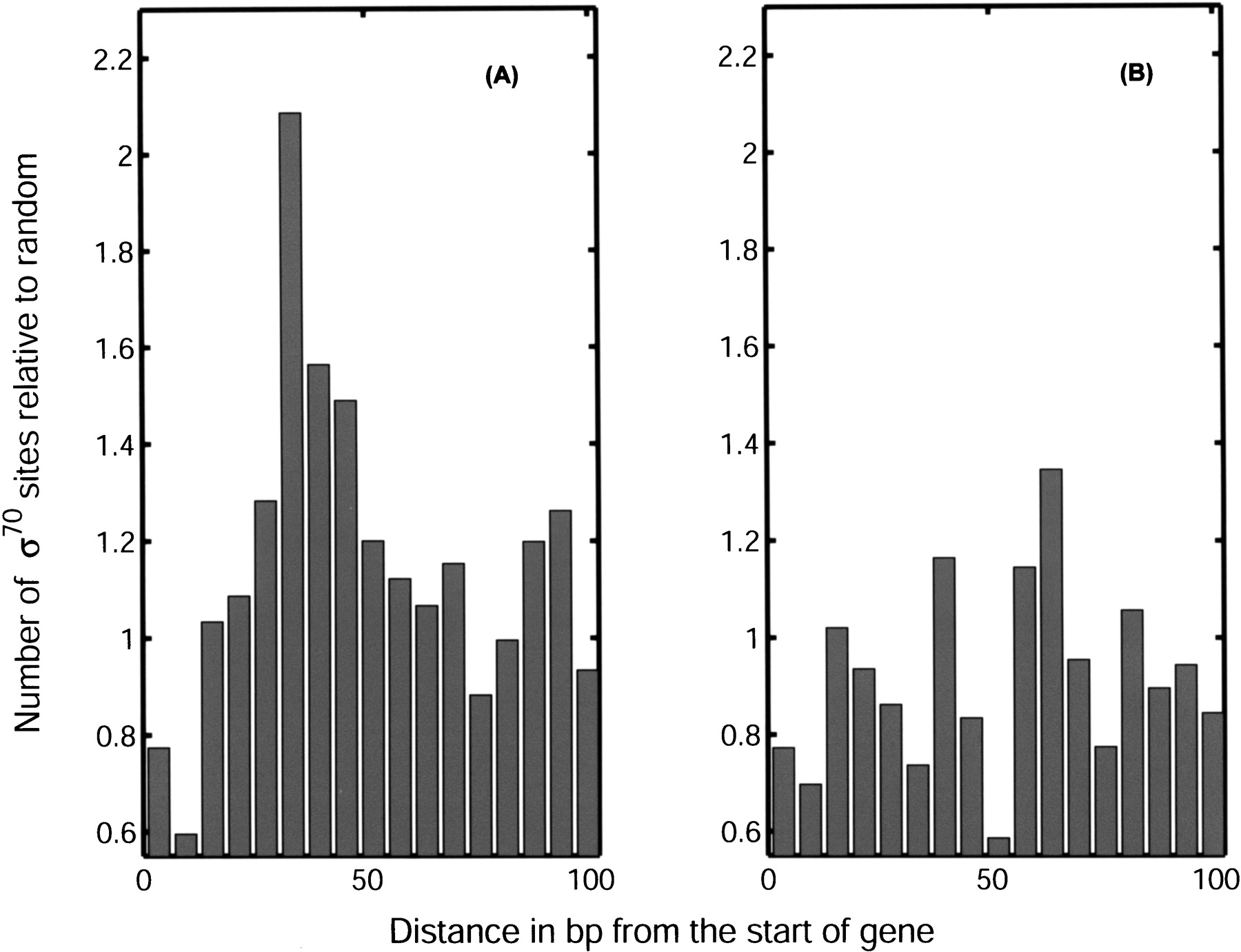Histograms of positions of candidate σ70 binding sites relative to the nearest downstream ORF. Distance is measured from the 3′ end of the binding site. (A) Histogram corresponding to putative promoter and gene located on the same strand; (B) on opposite strands. The positional distribution of candidate σ70 promoters peaks at 33 bp upstream of the ORF only in the functionally relevant, same strand, configuration.