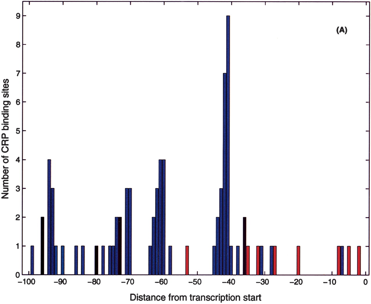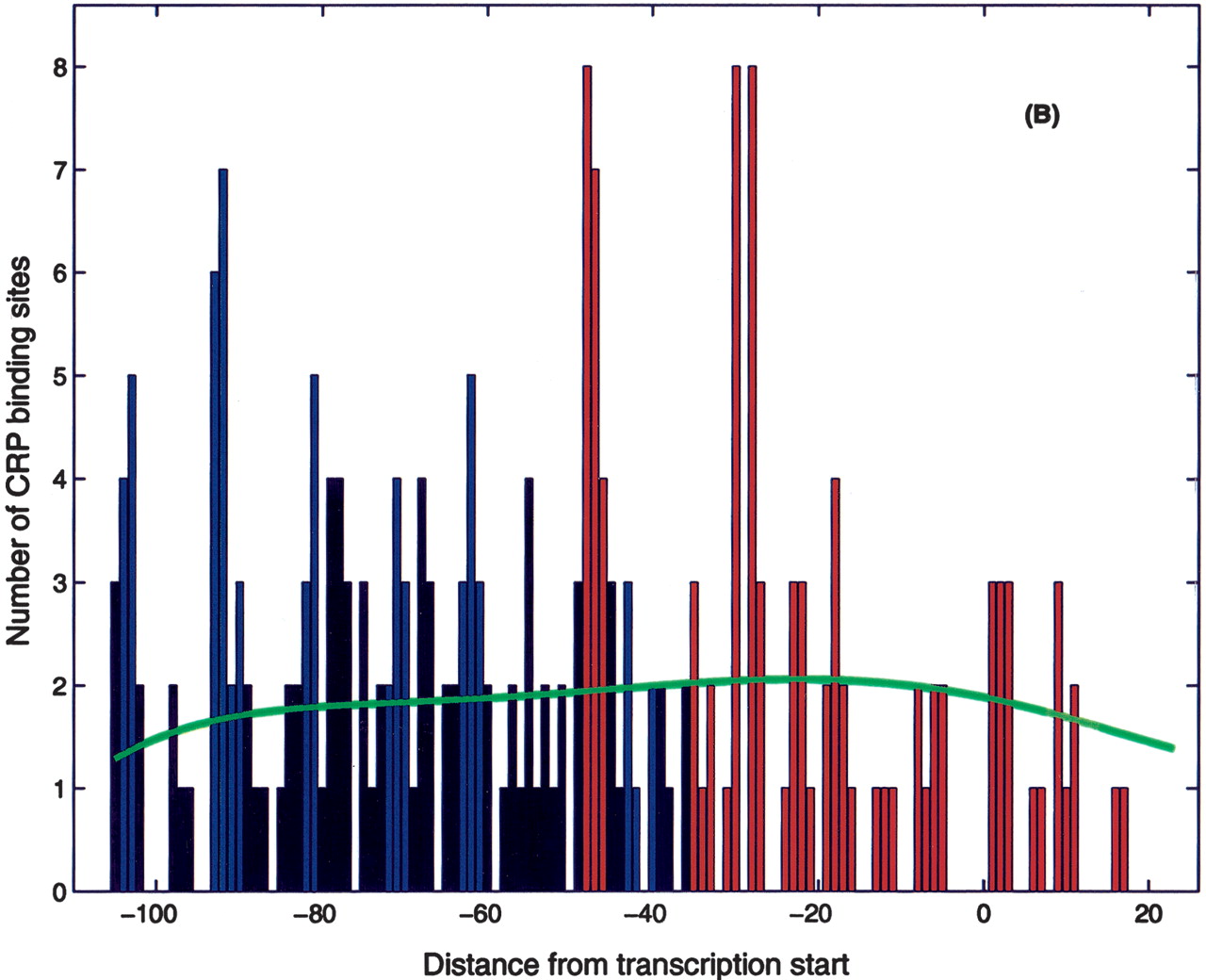 Positional distribution of CRP site centers relative to the (predicted) transcription start. (A) Known CRP sites (from RegulonDB):(blue) activator sites, (red) repressor sites, (black) unknown. (B) Candidate CRP sites found in the present search with position relative to transcription start inferred from the closest σ70 candidate binding site. Note the significant peaks of the distribution at -62, -72, -82, -93, and -103, that is, Class I positions. Note also the significant peaks at -48 and -29 positions, which we interpret as repressor sites. The proposed functional classification is (blue) activator sites, (red) repressor sites, (black) unknown. (C) Same as B with the addition of putative Class II CRP sites found in the composite CRP-σ70 site search. The green line represents the estimated background distribution.