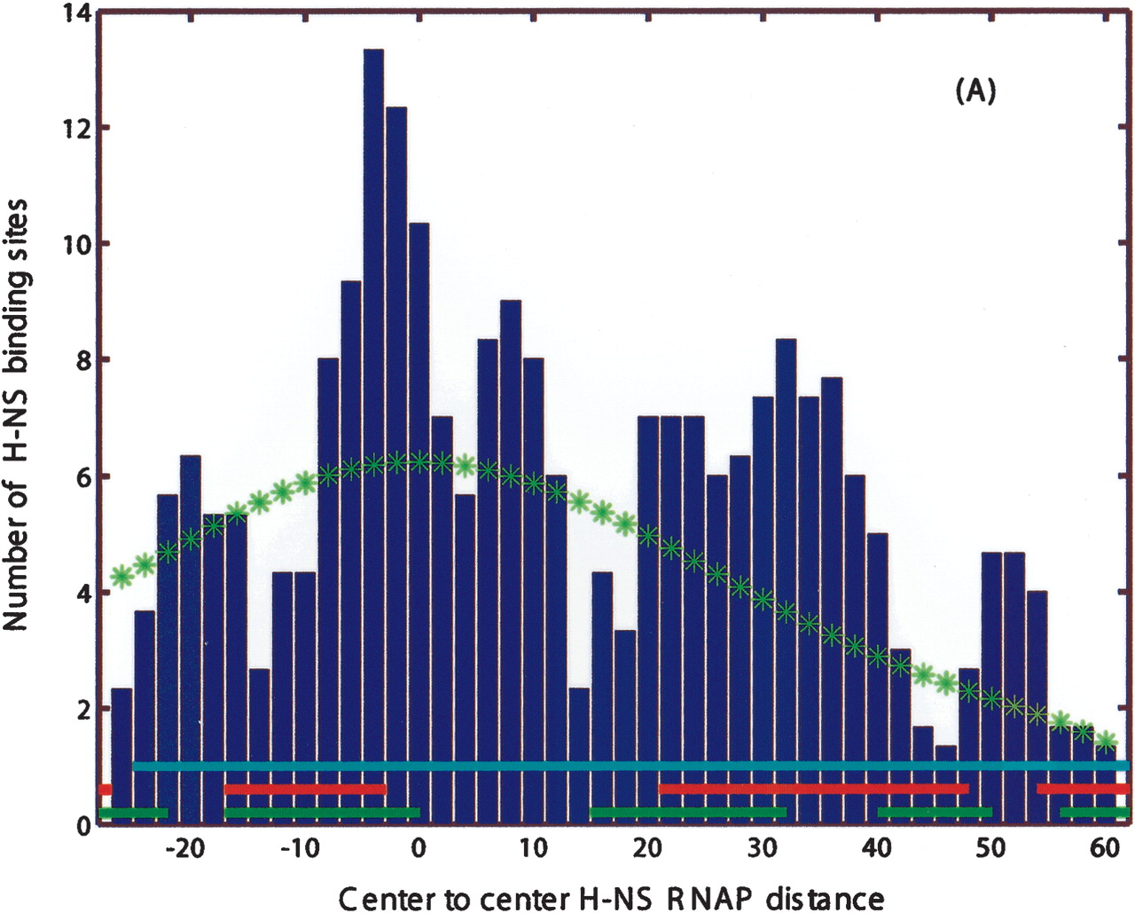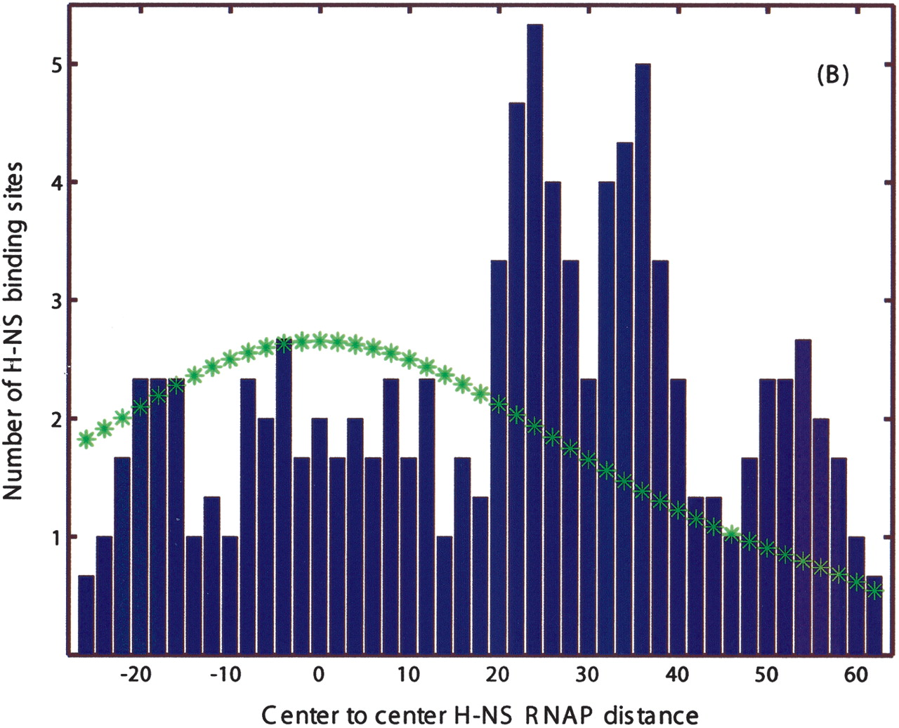 Positional distribution of candidate H-NS sites (centers) relative to putative RNAP-σ70 sites (centers). (A) All candidate H-NS sites within the represented range of distances. Note the significant peaks at relative positions near -4 and 8, which correspond to direct overlap, and at positions 25, 35, and 52, where H-NS is downstream of the promoter. Horizontal bars correspond to footprinted H-NS sites from Falconi et al. (1998), Lucht et al. (1994), and Soutourina et al. (1999). (B) Same as A but excluding weak candidate RNAP-σ70 promoters (i.e., sites with high E/µ “score”). The disappearance of the -4, 8 peaks indicates that they may function as activators. (*) Estimated background distribution.