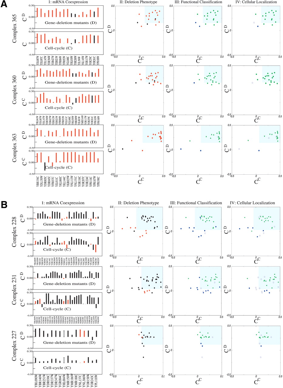 Characterizing three essential and nonessential complexes. (A, column I) mRNA coexpression patterns for three large complexes identified in Gavin et al. (2002). For each protein subunit (identified at the bottom of each panel), we show the average correlation coefficient for their corresponding relative mRNA expression level with all other subunits based on the microarray data obtained on gene deletion mutants (CD, top plot; Winzeler et al. 1999; Hughes et al. 2000), and cell cycle measurements (CC, bottom plot; Cho et al. 1998; Spellman et al. 1998). We denote by red the known essential proteins and by black the nonessential proteins. (Column II) Cross-correlation plot obtained by plotting for each protein i within the three selected complexes the cell cycle correlation coefficient CiC on the horizontal axis, and the gene deletion correlation coefficient CiD on the vertical axis. Each symbol corresponds to a single gene product (protein), the color reflecting its known deletion phenotype (red: essential; black: nonessential). The shaded area separates the highly coexpressed core proteins, the boundaries of the area being given by CiC = C̄C - σC and CiD = C̄D - σD. (Column III) The same coexpression plot as in column II, but the symbols are color-coded based on the functional classification of the corresponding proteins. The green symbols denote gene products that belong to the majority regarding their known functional role (Complexes 365 and 360: green proteins simultaneously belong to protein fate and subcellular localization; Complex 363: transcription) unfilled symbols denote proteins with unknown functional role; and the blue symbols denote those subunits that do not share the functional classification with the majority. (Column IV) Coexpression plot with proteins colored based on their known cellular localization. Green symbols denote those with the same subcellular localization, which is nucleus for all three complexes. Blue symbols denote proteins whose localization differs from the majority, and unfilled symbols represent those with unknown cellular localization. In columns II-IV, we used a two-dimensional representation to demonstrate that the essentiality-, functional-classification-, and cellular-localization-based separation is simultaneously present by using two widely different transcriptional data sets. A control plot with only the Cho et al. (1998) cell cycle data is shown in the Supplemental material. (B) The same as A, but for three complexes with predominantly nonessential subunits. In column II, we used red squares to denote those essential proteins that are part of the core of other essential complexes. In column III, the green symbols represent proteins participating in synthesis. In column IV, the green symbols denote proteins localized in the mitochondria for all three complexes.
