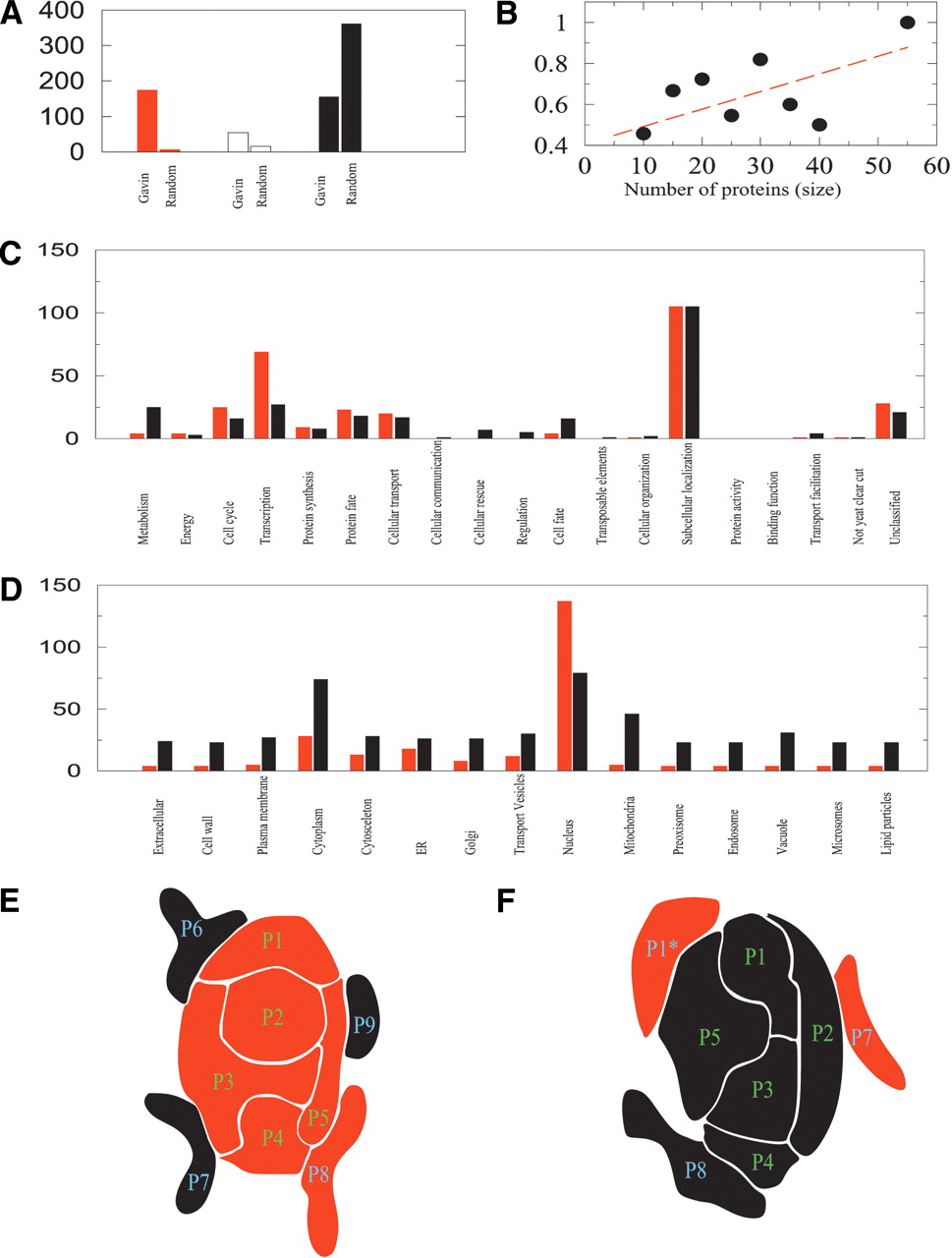 Characterization of the protein complex ensemble and schematic illustration of the internal organization of protein complexes. (A) The number of complexes in the Gavin et al. (2002) data set that are found to be essential (red), nonessential (black), and of unknown (white) deletion phenotype. Next to each column we show the number of corresponding complexes if the proteins were randomly distributed in the various complexes, indicating the highly nonrandom character of the complex composition and essentiality. For this, each protein subunit of the known Gavin et al. (2002) complexes is replaced with proteins randomly selected from the yeast proteome. (B) The size dependence of essentiality in protein complexes. The plot shows the fraction of essential subunits within the complex (vertical axis) as a function of the number of protein subunits in the complexes (horizontal axis). (C) The predicted functional classification of the complexes identified by Gavin et al. (2002), showing separately the number of essential and nonessential complexes found in each functional class. (D) The predicted cellular localization of the identified essential and nonessential complexes. A full list of predictions for each complex is shown in the Supplemental material. (E) We find that 43% of the protein complexes possess a core comprised of highly coexpressed proteins, that are all essential and belong to the same functional class, indicating that they represent the functional building blocks of the complex. Such core is shown schematically as tightly locked P1-P5 proteins. Mass spectroscopic methods inevitably identify other proteins as well with those complexes. Yet, we find that these halo proteins (P6-P9) show a small coexpression pattern with the core, and are both phenotypically and functionally mixed, indicating that they likely represent proteins that display only temporal or spurious attachment to the complex. (F) Approximately 46% of the complexes have a core composed of predominantly nonessential proteins (P1-P5), surrounded again by a halo of proteins with mixed essentiality and functional classification (P6-P8). These complexes likely are not essential for cell growth; therefore, all core proteins are uniformly nonessential. The few essential proteins found predominantly in the halo of such nonessential complexes often simultaneously take part in the core of other essential complexes, explaining the origin of their essentiality. For example, the P1 protein, which is part of the core of the essential complex shown in E, could also attach to the surface of the nonessential complex shown in F. Therefore, the essentiality of P1* is derived not from its role in complex F, but from its role in the essential complex E.