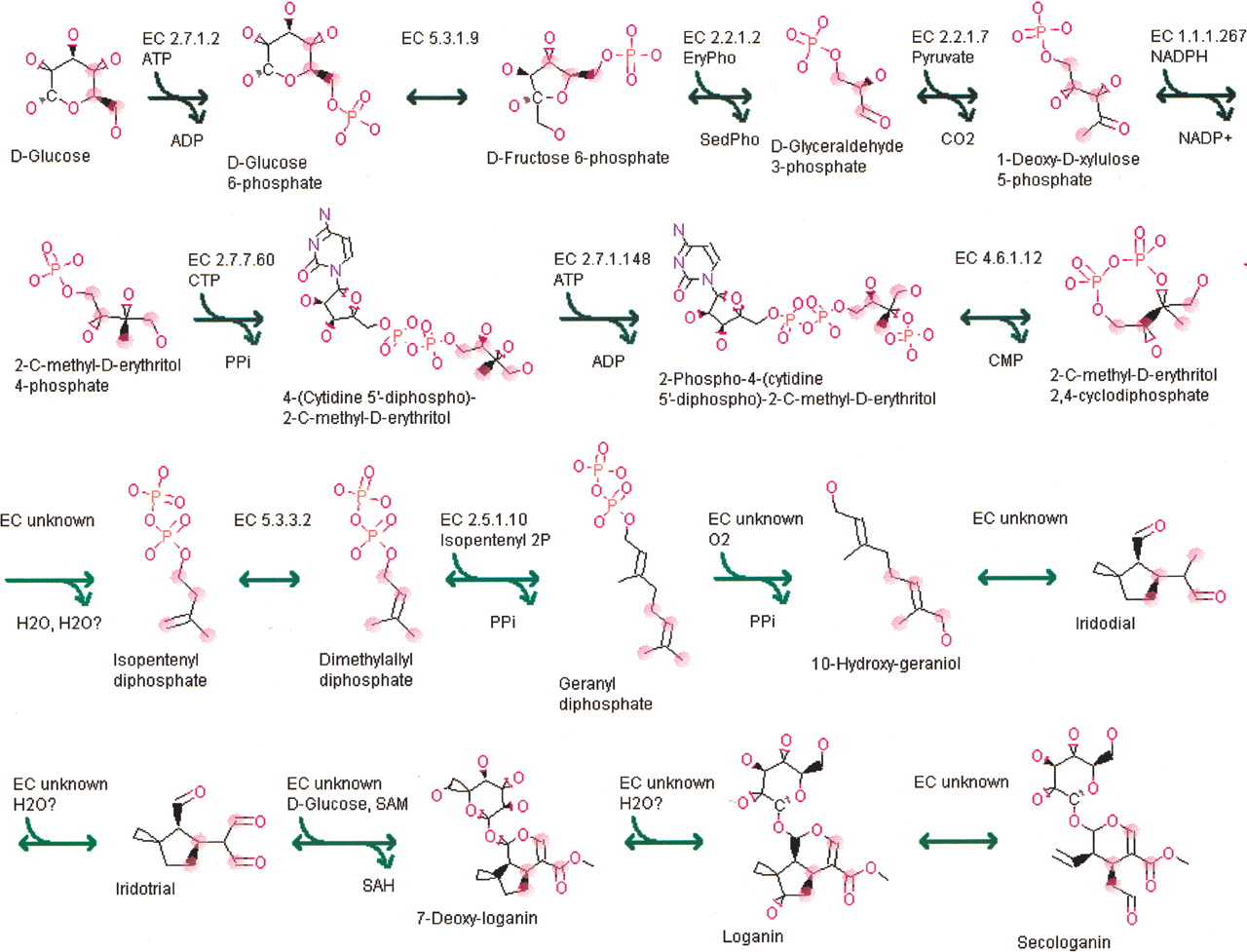 The pathway from d-glucose to secologanin. Positions highlighted in red show the conserved carbon atoms in this pathway.