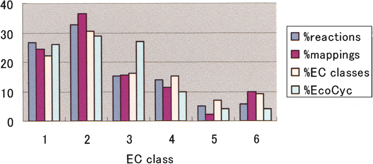 The number of reactions, mappings, and EC sub-subclasses in the E. coli metabolism against the total number of EC sub-subclasses in the EcoCyc database. Colors conform to those in Fig. 7.
