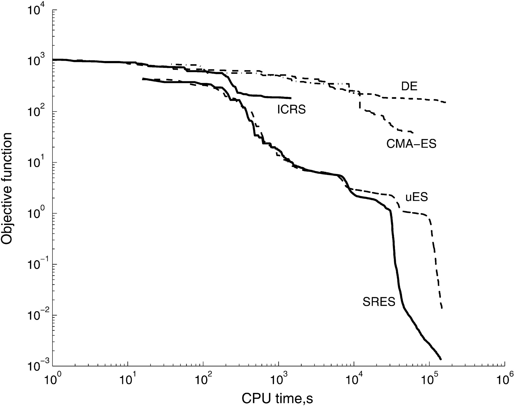 Convergence curves (objective function versus computation time, in seconds, using a PC/Pentium III 866 MHz).