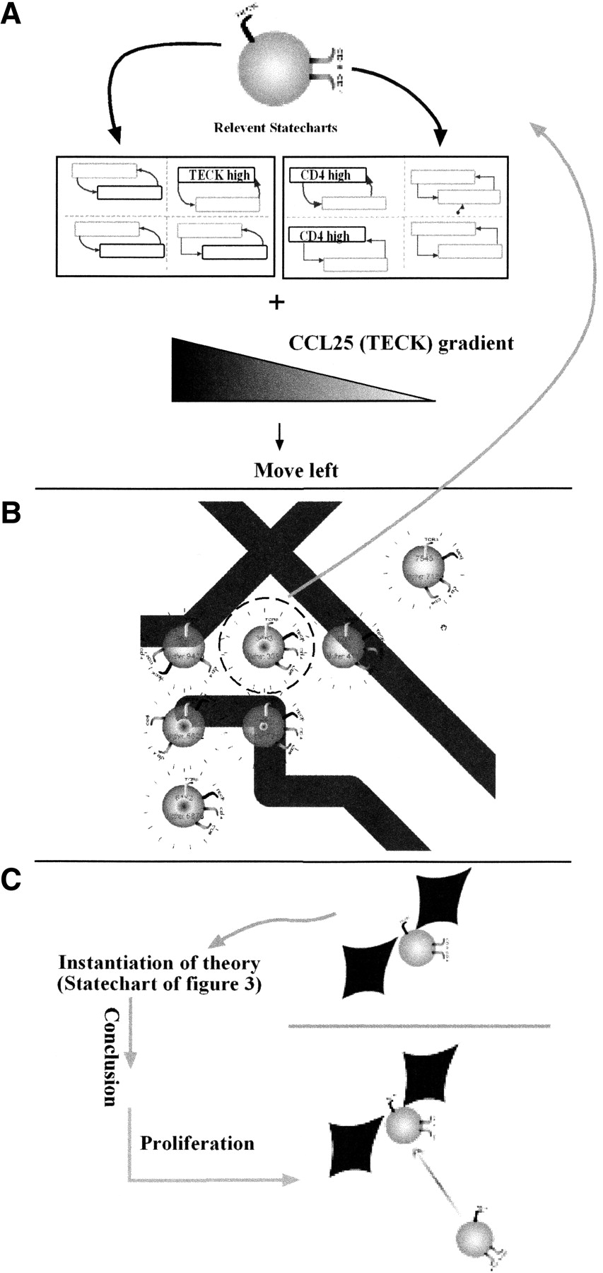 Decision making during simulation. The thyocyte surrounded by a circle in A decides where to migrate according to statecharts similar to the ones portrayed in B. The thymocyte in C, after making physical contact with an epithelial cell, instantiated the theory portrayed in Figure 3, concluding that it should proliferate.