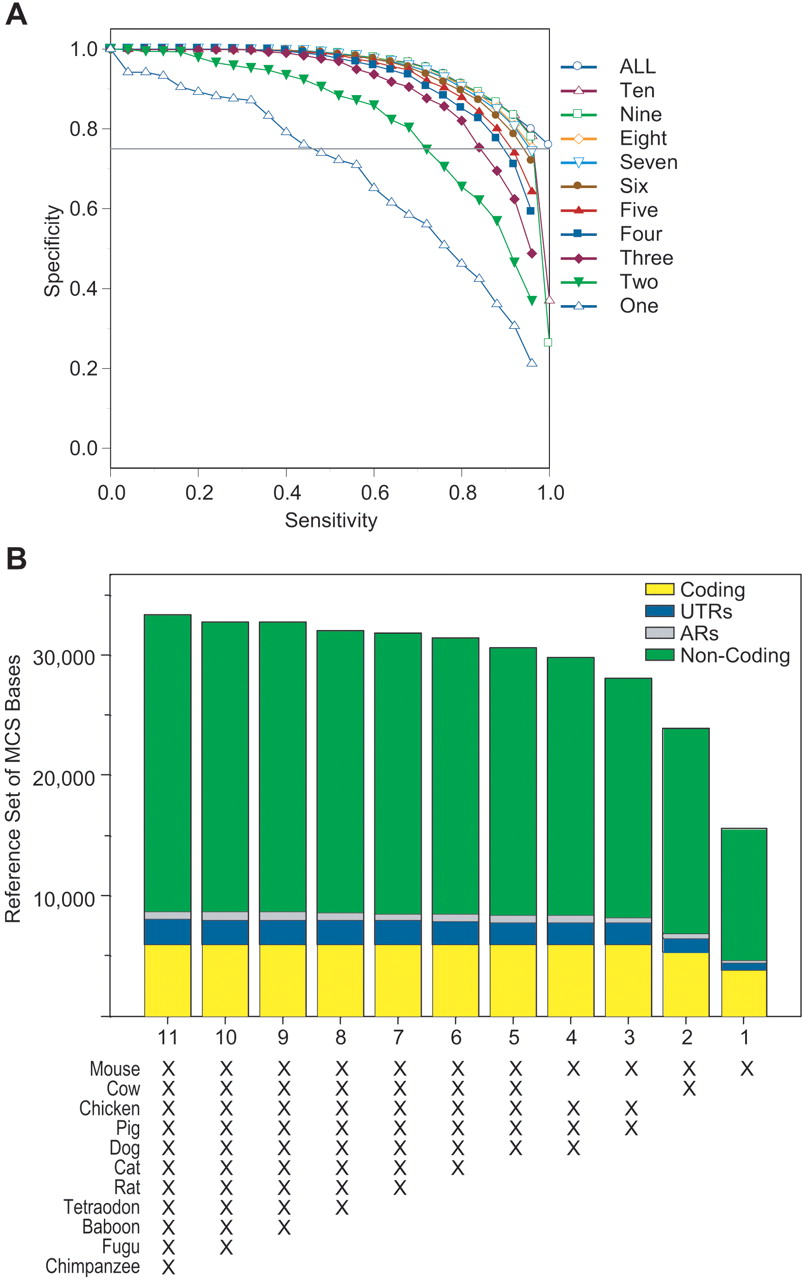 Ability of combinations of different species' sequences to detect MCSs. Sequences from every combination of the 11 non-human species were analyzed by the binomial-based method, and the subset of each possible number of species (from 1 to 10, in addition to human) yielding the highest sensitivity at 75% specificity was identified. Note that the ranking of the subsets remains essentially the same for a wide range of specificity thresholds. (A) The resulting relationship between sensitivity and specificity is shown for each subset (see Fig. 7A for details). (B) Detection of reference MCS bases (see Fig. 7B for details), shown for each best-performing subset of species using data obtained with a specificity of 75% (horizontal grey line in A). Note that the far-left bar represents the entire set of reference MCS bases (see Fig. 7B). The underlying data associated with these analyses are available at http://www.nisc.nih.gov/data.