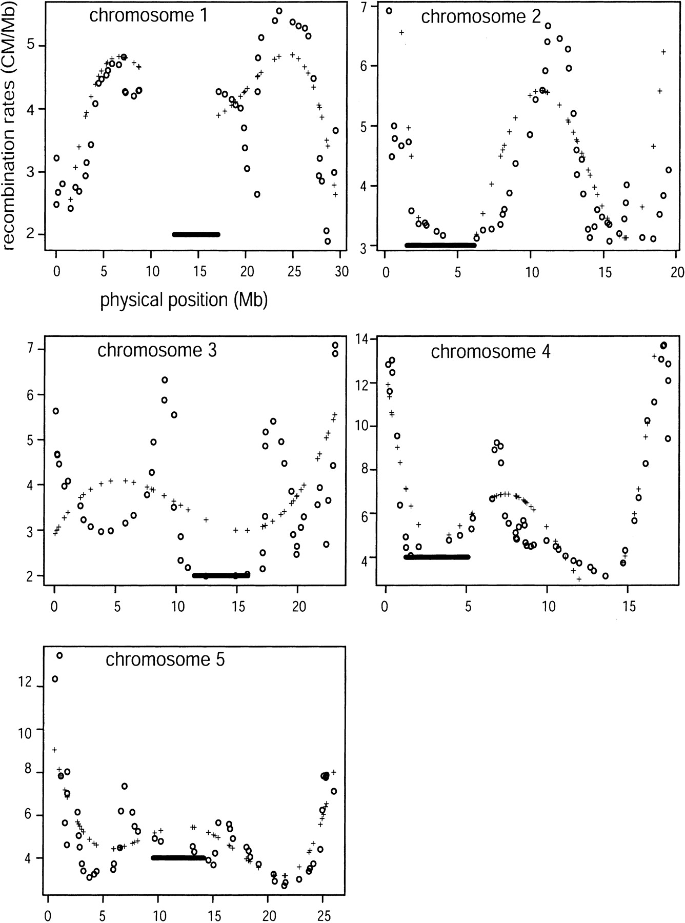 Recombination rates estimated by the global and local approaches. + represents global rate estimates by a fifth-order polynomial; circles represent local estimates. The bar represents the centromeric region and estimate recombination rates in this region.