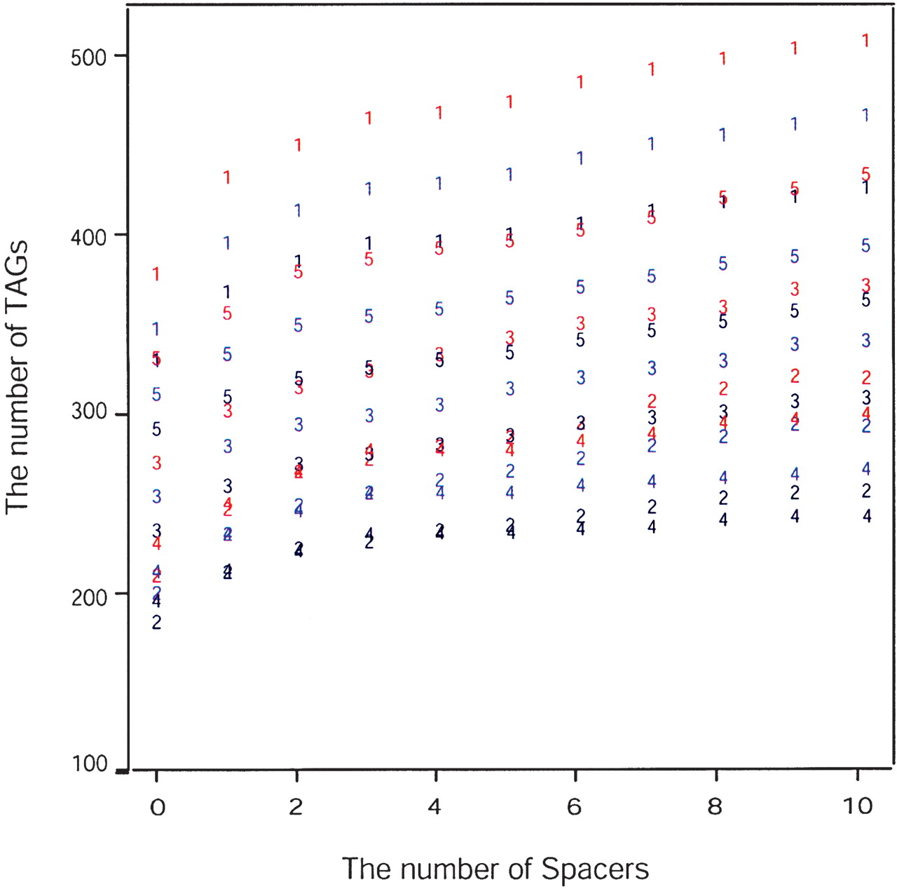 The number of TAGs as a function of spacers and E-values. The numbers represent the chromosomes. For each chromosome, red numbers represent TAGs identified with an E-value 10-10, blue numbers represent TAGs identified with an E-value of 10-20, and black numbers represent TAGs identified with an E-value of 10-30.