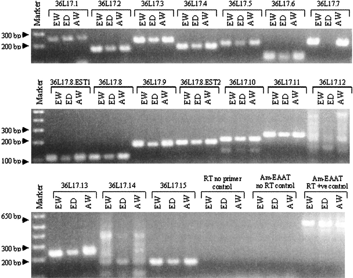 Reverse transcription analysis of putative transcripts. RT-PCR was performed on RNA obtained from European worker (EW), European drone (ED), and Africanized worker (AW) heads. Primers were designed to an exon in each transcript. The putative transcripts from 36L17.1 to 36L17.15, 36L17.EST1, and 36L17.EST2 were visualized after 20 cycles. Positive control primers to the Apis glutamate transporter (Am-EAAT +ve control) produced the expected size fragment of 525 bp. The negative control using Taq Polymerase (Am-EAAT-No RT control) confirmed the lack of DNA contamination. With the exception of 36L17.12 and 36L1714, all predictions, including the segments corresponding to the EST hits, generated single RT products of the expected sizes in Africanized and European workers. 36L17.12 and 36L17.14 produced multiple RT-PCR products of varying sizes, indicating a possible failure of the RT-PCR reaction, nonspecific reaction products, or an absence of expression of that particular transcript in the bee head. With the exception of 36L17.7, all products seen in European workers were seen in European drones. RT-PCR products from most transcripts appeared to be present at a lower level in drones in comparison with workers in several cases. In contrast, 36L17.1 appeared to have a slightly elevated level of transcript in the drone sample in comparison with that of the workers. All transcripts seen in European worker heads appear to be expressed in their Africanized counterparts at similar levels.