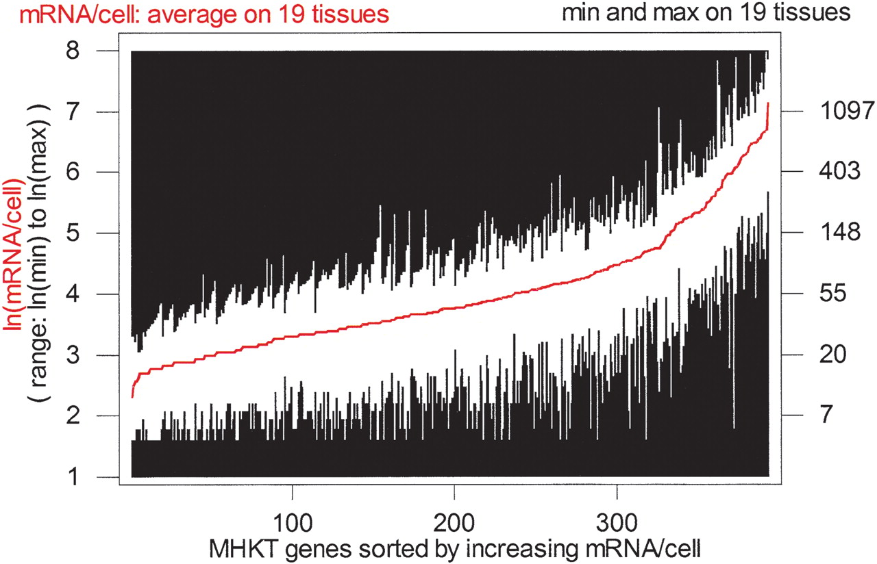 Range of expression of the genes of the MHKT. Average (red curve) and min-to-max range (white bars) of expression for the 393 genes of the MHKT in 19 tissues (from Velculescu et al. 1999).