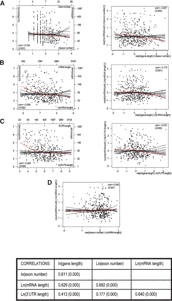 Relationship between expression and morphological parameters. (A-C, left panels) Scatter plots of ln(mRNA/cell) versus ln(exon number), ln(mRNA length), and ln(3′-UTR length), respectively. The red curves represent lowess smooths, and the black curves lowess smooths from random permutations. mRNA expression has strong negative associations with all these parameters. (A-C, right panels) Added variable plots for ln(mRNA/cell) versus ln(gene length) after correcting for ln(exon number), ln(mRNA length), and ln(3′-UTR length), respectively. Red and black curves are again lowess smooths on original data and random permutations; (res) residual. All three of these parameters account for a substantial portion of the negative association between expression and gene length, but leave a substantial remainder effect, lending support to a role of transcriptional elongation. The table at the bottom of the figure contains correlations between parameters. Because of the very high positive correlation between exon number and mRNA length, the effects of splicing and mRNA stability and their contributions to the effect of gene length, although individually observable, are confounded. This is shown by panel D, which contains the added variable plots for ln(mRNA/cell) versus ln(exon number), after correcting for ln(mRNA length). (corr) Correlation coefficient. p-values are in parentheses.
