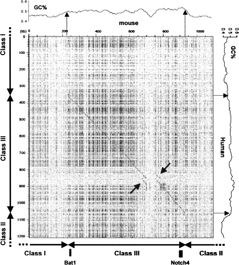 DOTTER (version 3.1, default setting) dot-matrix comparison of the extended human and mouse MHC class III regions. The X-axis represents the mouse sequence, the Y-axis the human. The depicted human and mouse sequences begin at POU5F1 (in the class I region, for both human and mouse) and extend to TSBP. The location of the class III region to class I and II is indicated using arrows outside the top X-axis and left Y-axis. Only a portion of the human and mouse class I and II regions is included as indicated by the open arrows. GC contents were also determined and are shown above the axes. Arrows in the GC plots define the class III region as a GC-rich isochore. In mouse, the locations of the first class III gene, Bat1, and the last class III gene, Notch4, are shown as black boxes. There are a pair of short diagonal lines (see the arrows inside dot plots) away from the main diagonal axis, that correspond to the C4-CYP21 module (see text). Interspersed repeats are represented by the background dots.