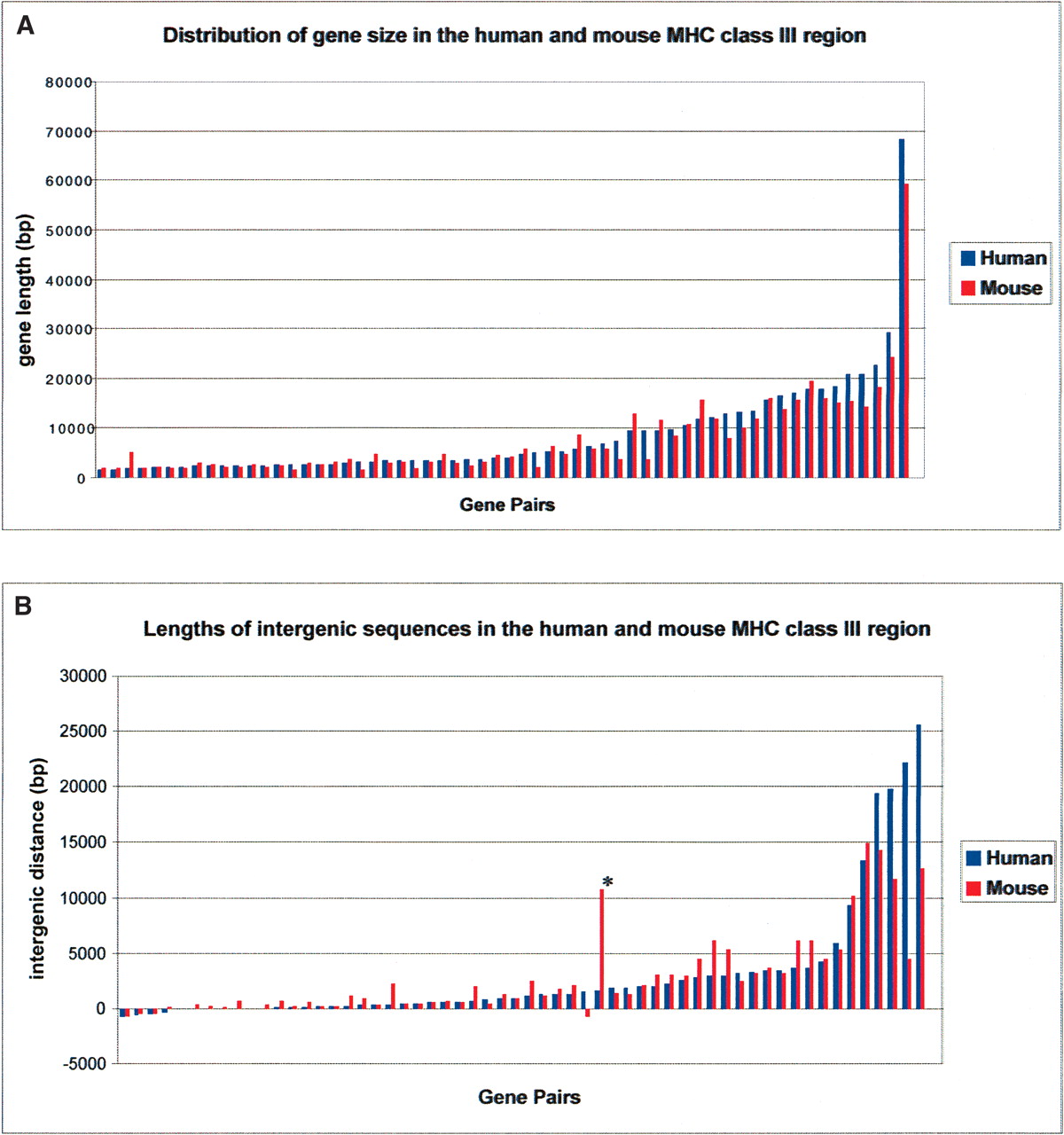 Distribution of gene size (A) and intergenic sequences (B) for the human and mouse MHC class III gene pairs. The X-axis coordinate is the rank order of the human genes. The outlier in B (indicated by *) results from a mouse-specific insertion between the Lsm2 and Vars2 genes, which also harbors the mouse unique gene, G7e. The intergenic distance of mouse Lsm2 to its closest upstream gene, G7e, is 10,829 bp; whereas there are only 1588 bp from the human LSM2 gene to its closest upstream gene, VARS2. Supporting data can be found in Supplemental Table 2.
