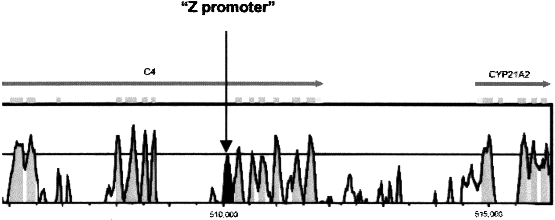 Distal cis-element found by CNS analysis. The Z promoter (Wijesuriya et al. 1999) of the human CYP21A2P gene is located in the 35th intron of its upstream gene, C4B. This promoter sits exactly in a conserved noncoding sequence, represented by a black peak.