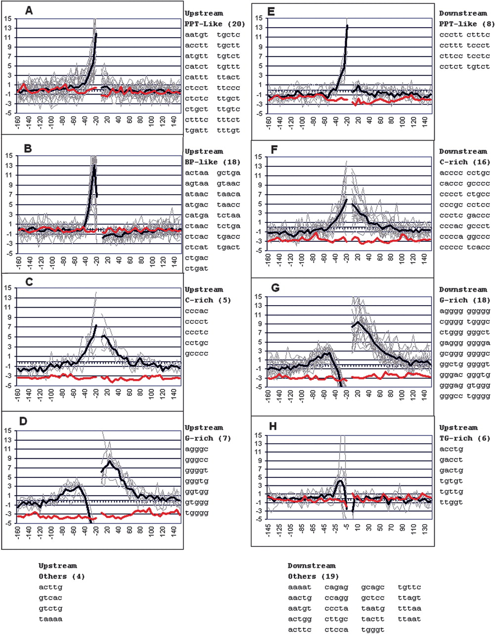 Grouping and distribution of the top positively scoring flanking pentamers. A subset of 121 positively weighted pentamers that contributed most to the ability of SVM to distinguish real from pseudo exons were grouped according to their similar positional distributions of their prevalence around exons, as measured by a z-score (see text). Z-scores with an absolute value greater than 2 have a P-value of less than 0.05. Values were summed for pentamers starting in windows of 5 nt starting just upstream of the acceptor site (-15) and just downstream of the donor site (+7); an exception is panel H, in which upstream windows up to the exon (-1) are shown. Light gray lines represent individual pentamers listed on the right; the heavy dark line is the average. The red line shows the average for the distribution of these pentamers around pseudo exons. Pentamers in each flank were treated separately for extraction from SVM and for clustering. However, their prevalence is shown both upstream and downstream of the exons regardless of their origin.