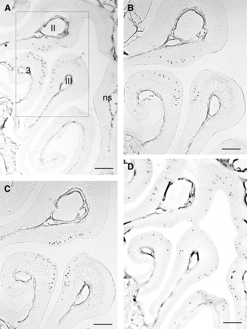 In situ hybridizations of digoxigenin-labeled antisense riboprobes specific for representative OR genes from chromosome 4 on adjacent coronal sections through the mouse nasal cavity.Neurons expressing a gene from family 262 are detectable exclusively in three distinct areas of the sensory epithelium, located on endoturbinates II, III, and on ectoturbinate 3 (A,B,C).A representative gene from family 259 is distributed throughout the dorsal zone of the epithelium.(A) mOR262-2, (B) mOR262-9, (C) mOR262-1, (D) mOR259-9.Boxed area in (A) is shown in higher magnification in (B,C).ns, nasal septum.Scale bars = 500 μm in (A,D) and 200 μm in (B,C).