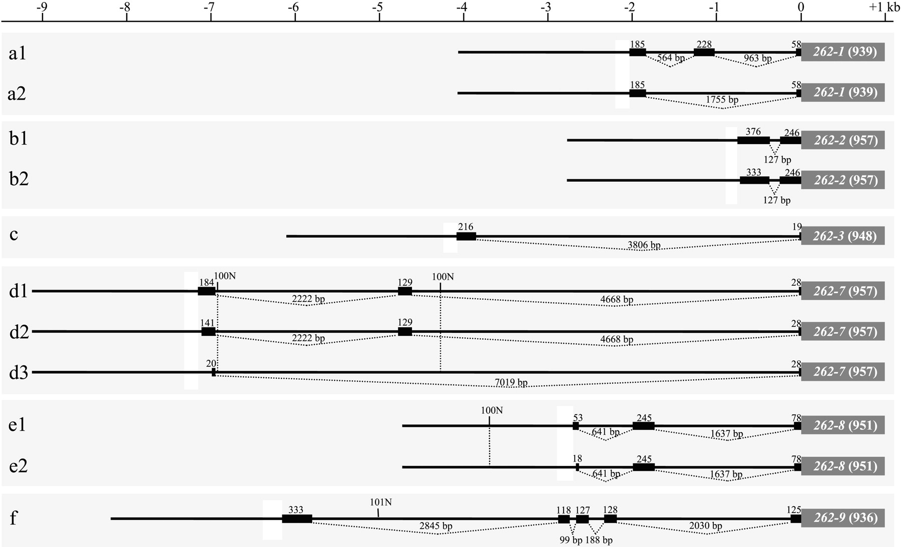 Gene structures of mOR-262 genes from cluster II based on 5′ RACE experiments.All genes are aligned according to the initial methionine (position 0 kb).Boxes represent exons; lines below indicate intronic regions (lengths are given in kilobases).White blocks upstream of the initial exons mark the extension of conserved sequence stretches.Alternatively spliced isoforms are indicated by sequential numbers.Regions which are not yet sequenced are indicated with number of Ns.Numbers in brackets indicate the length of the coding sequence in bp.