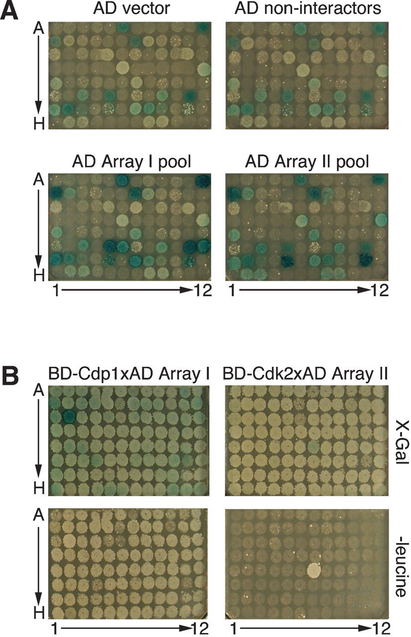 Detection of interactions using the two-phase strategy. (A) Phase 1 mating results. An array of 47 BD strains, duplicated on the right and left halves of a 96-well plate, was mated with four different AD cultures: the strain with the empty AD vector, a pool of strains from the array of 96 noninteractors (AD noninteractors), a pool of 96 strains from AD Array I, and a pool of 96 AD strains from AD Array II. Positions H6 and H12 have no BD strain. The diploids from each mating were replicated to —leu X-Gal plates. The results show that one or more strains in the AD Array I pool interact with BD fusions at positions A6, B1, B2, F5, F6, G1, and G5, and the duplicate versions on the right half of the plate. The AD Array II pool interacts with BD fusions at positions B1, B2, D6, G2, and G5, and the duplicates. (B) Phase 2 mating results. A strain expressing BD-Cdp1 was mated with AD Array I, which contains AD-Cdi3 at position C2. A strain expressing BD-Cdk2 was mated with AD Array II, which contains AD-Cdi5 at position E7. Diploids were replicated onto two kinds of indicator plates: X-Gal and —leu. The Cdk2–Cdi5 interaction is evident from growth on the —leu plate and the light blue yeast on the X-Gal plate. Because BD-Cdp1 activates the LEU2 reporter on its own, the Cdp1–Cdi3 interaction is only evident on the X-Gal plate, where the yeast are blue.