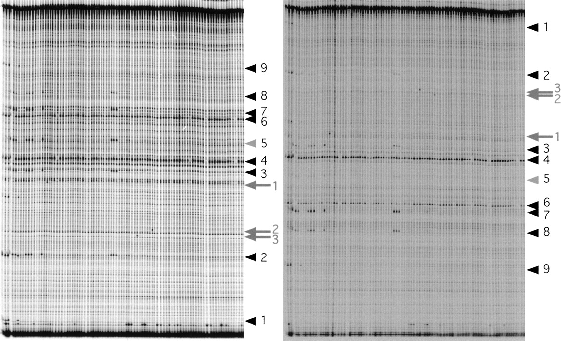 Representative example of a gel used to screen 384 fish for mutations in the dicer gene. Each of the 96 lanes of the polyacrylamide gel contains fourfold-pooled CEL-1-digested PCR products of ∼830 bp. The IR Dye 700 and IR Dye 800 channels are shown at left and right, respectively. Arrowheads indicate nine SNPs present in the founder fish. SNP no. 5 is only visible in one channel, and therefore, indicated by a gray arrowhead. Arrows indicate the three potential mutations on this gel (all rank 1).