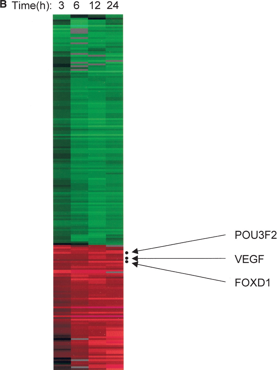Characterization of a ZFP-TF-activated gene expression profile. (A) A gene expression profile obtained with a ZFP-TF in two different cell lines. A ZFP activator, F2840-p65, was either stably expressed in 293 cells (left) or transiently expressed in HeLa cells (right). In both experiments, insulin was highly expressed (marked by arrows). Dots colored in red were not subjected to analysis to avoid false results due to tailing. (Bottom) Plotting of the logarithmic expression ratios of each experiment and the correlation coefficient of two experiments. (B) Time-course analysis of gene expression driven by a ZFP-TF. A 293 cell line stably expressing a ZFP activator, F475-p65, was treated with Dox for the times stated. Genes identified as primary targets are marked.