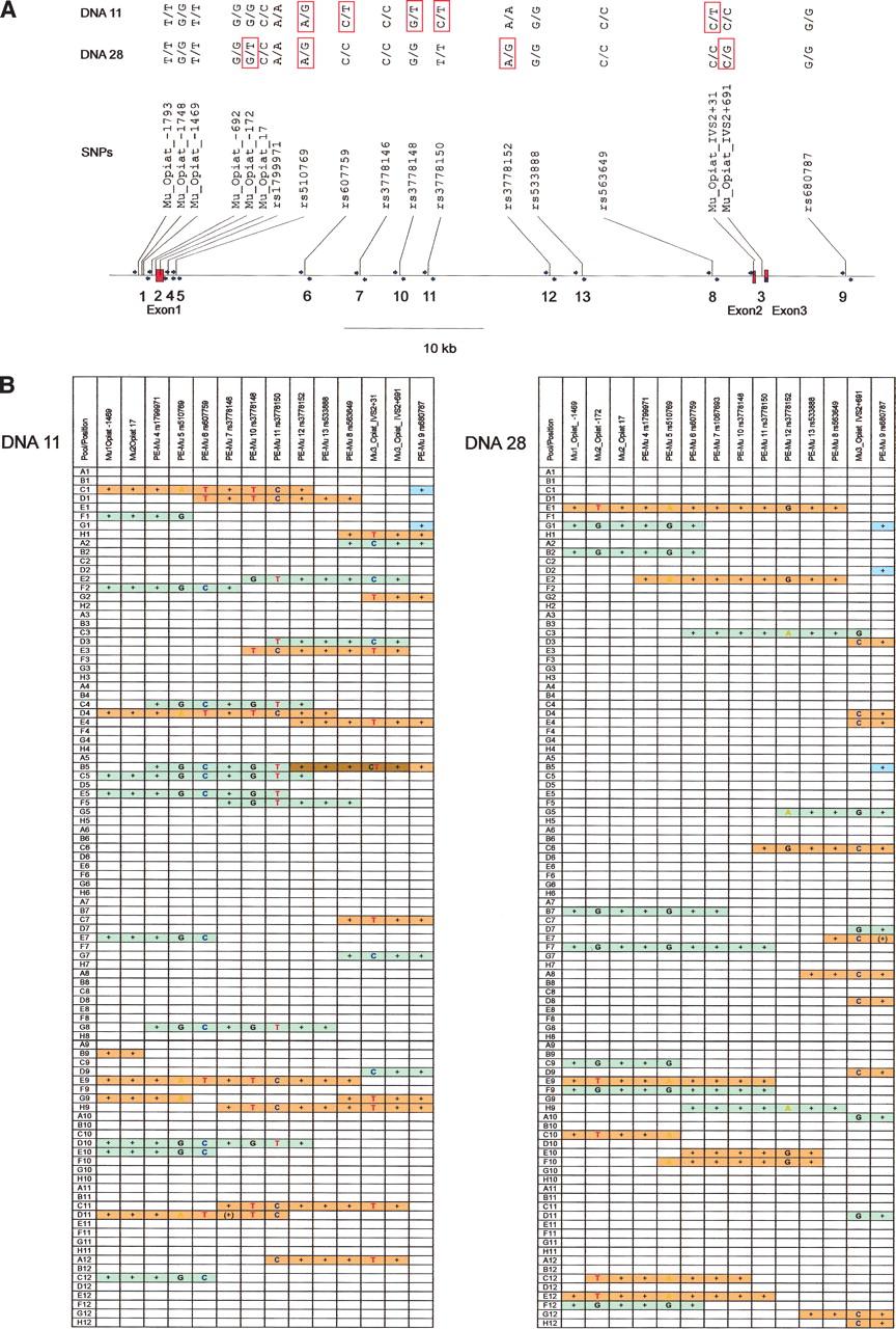 (A) Schematic drawing of the OPRM1 genomic region. SNPs are indicated and tagged with the published names (NCBI dbSNP-database; Hoehe et al. 2000). The genotypes of DNA11 and DNA28 are shown in the top lines. (B) Results for the haplotyping of DNA11 and DNA28. The different haplotypes are represented in red and green, respectively. A“+” indicates positive a PCR of SNPs that were previously found to be homozygous for DNA11 and DNA28, respectively. The letters A, C, G, and T denote the result of the haplotyping by the GOOD assay of the pools analyzed. Blue bars: pools where only homozygous SNPs are detected. Brown indicates the presence of two clones of different haplotypes in one pool.