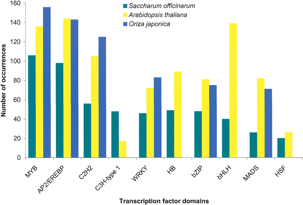The 10 most common transcription factor Pfam domains in SAS proteins. The 43,141 SASs were translated using the ESTScan algorithm, and the resulting 40,821 amino acid sequences were then entered as queries in the Pfam database using the default settings of Pfam 7.0 [“global and local alignments merged” and “Pfam gathering threshold (GA)”]. The 10 most represented domains typical of transcription factors are indicated along with the number of occurrences for each one. The number of predicted transcription factors found in Arabidopsis thaliana (Riechmann et al. 2000) and Oryza japonica (Goff et al. 2002) for the corresponding domains are also indicated.