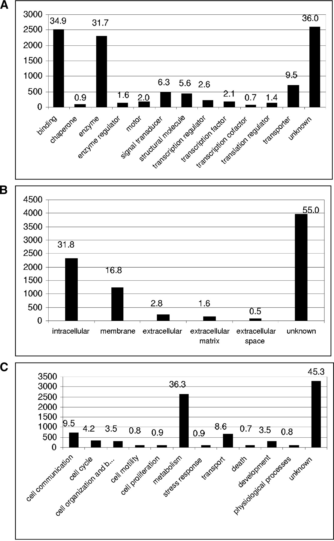 Distribution of the EST consensus sequences into the main Gene Ontology (GO) functional classes. Of 7146 consensus sequences, 5114 could be annotated in at least one of the three Gene Ontology (GO) defined functional classes. The numbers above the bars represent the percentage of all sea urchin clusters with a significant match to the SWISS-PROT database that are classified in the given functional class. The height of the bars and the ordinate give the number of proteins per group. (A) 4570 proteins could be associated with a molecular function, (B) 3219 proteins with a potential cellular component, and (C) 3910 proteins were associated with a specific biological process. A total of 2426 proteins were annotated in all three main categories.