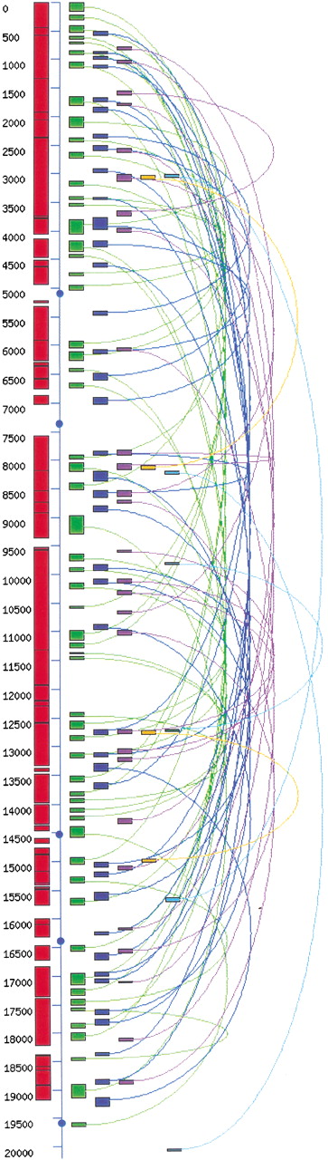 Map of duplicated regions identified in the Arabidopsis pseudo ancestral genome. The vertical line represents a single chromosome containing 20,187 genes ordered according to a procedure that merged the recent blocks (see text) to approximate the ancestralArabidopsis genome before the last polyploidy event. Red boxes depict the sections of the pseudo genome corresponding to merged sister regions. Other shaded boxes at right represent duplicated regions identified in the pseudo ancestral genome (colors are used for clarity and do not depict any age classification). Curved lines link paired regions, and circles depict the regions corresponding to the centromeres in the real genome.
