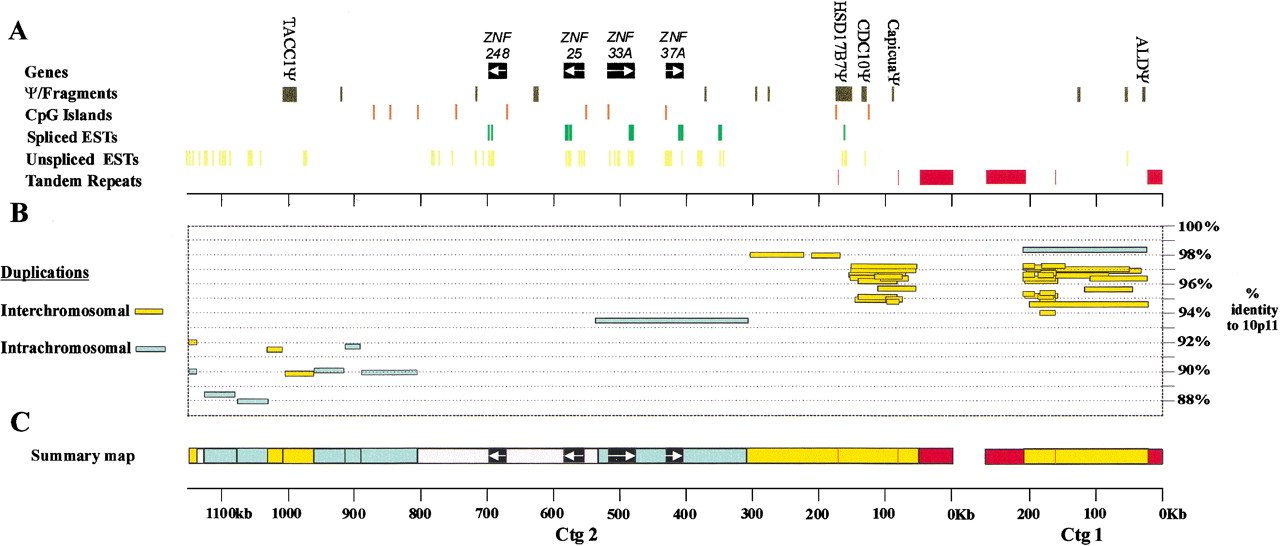 Overview of 10p11 sequence data. (A) Principle features of sequence: The position of known genes (Table 1) and pseudogene fragments (http://www.ncl.ac.uk/ihg/10p11.htm), CpG islands, spliced and unspliced ESTs (Table 1), and tandem repeats (Table 3). The orientation of gene transcription is indicated with white arrows. (B). Paralogs of the 10p11 sequence within the human draft. These have been divided into interchromosomal (yellow) and intrachromosomal (blue). The position of each independent BLAST hit greater than 5 kb in length within the EMBL-NR and EMBL-HTG databases are represented by a horizontal line. Both the extent of the BLAST hit within the 10p11 sequence (x-axis) and the % identity to the 10p11 sequence (y-axis) is indicated (see Methods). Deletions and insertions within individual sequence matches are not shown. (C) Summary map showing genes, satellite repeats, and duplications for reference with later Figures. Because satellite repeats anchor this map, the physical scale of each contig is indicated in 100 kb intervals moving away from the centromere towards 10pter (right toleft). For details of sequence analysis see Methods. The sequence composition of the ∼27–600 kb gap between contigs 1 and 2 is unknown.